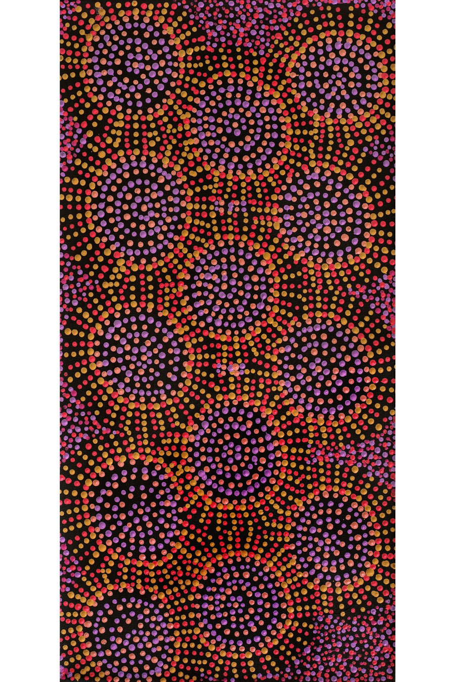 This ‘jintiparnta Jukurrpa’ (desert truffle [Elderia arenivaga] Dreaming) comes from Mina Mina. Mina Mina is an extremely important ceremonial site for Napangardi and Napanangka women that is located approximately 600kms west of Yuendumu, just east of Lake Mackay and the WA border. The area has a ‘marluri’ (salt lake or claypan) that is usually dry, without water. There are also a number of ‘mulju’ (soakages), sandhills, and a large stand of ‘kurrkara’ (desert oaks [Allocasuarina decaisneana]). The Mina Mina Jukurrpa is an important source of Warlpiri ritual knowledge and social organization, particularly relating to the different roles performed by men and women.