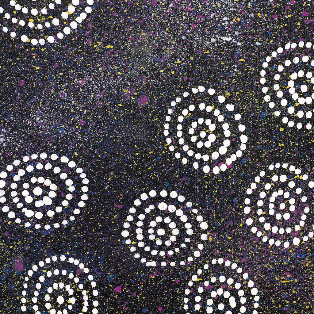 The Napaljarri-warnu Jukurrpa (seven sisters Dreaming) depicts the story of the seven ancestral Napaljarri sisters who are found in the night sky today in the cluster of seven stars in the constellation Taurus, more commonly known as the Pleiades. The Pleiades are seven women of the Napaljarri skin group and are often depicted in paintings of this Jukurrpa carrying the Jampijinpa man ‘wardilyka’ (the bush turkey [Ardeotis australias]) who is in love with the Napaljarri-warnu and who represents the Orion's Belt cluster of stars. Jukurra-jukurra, the morning star, is a Jakamarra man who is also in love with the seven Napaljarri sisters and is often shown chasing them across the night sky. In a final attempt to escape from the Jakamarra the Napaljarri-warnu turned themselves into fire and ascended to the heavens to become stars. The custodians of the Napaljarri-warnu Jukurrpa are Japaljarri/Jungarrayi men and Napaljarri/Nungarrayi women. Some parts of the Napaljarri-warnu Jukurrpa are closely associated with men’s sacred ceremonies of a very secretive nature. In contemporary Warlpiri paintings traditional iconography is used to represent the Jukurrpa, associated sites and other elements. Often depicted in paintings for this Jukurrpa is the female star Yantarlarangi (Venus - the Evening Star) who chases the seven Napaljarri sisters for having stolen the night from her.