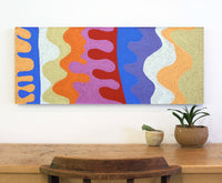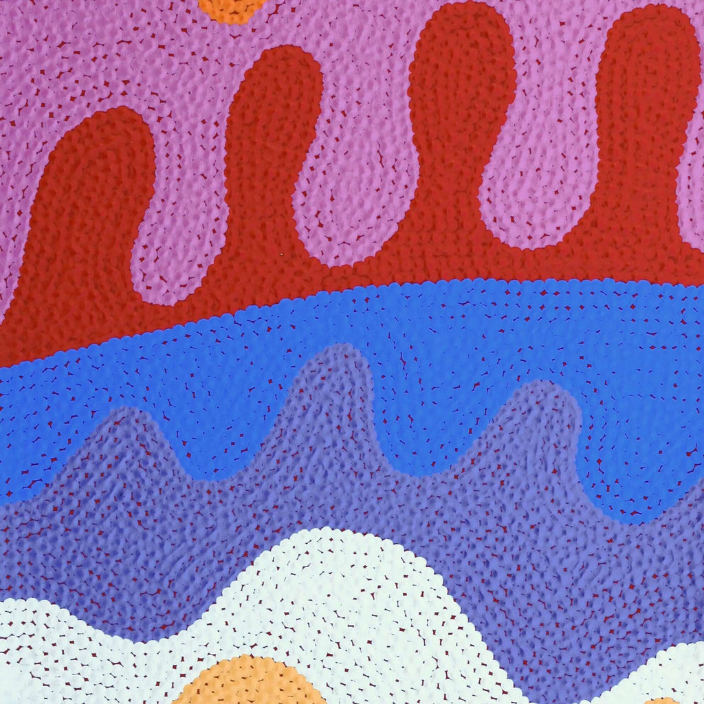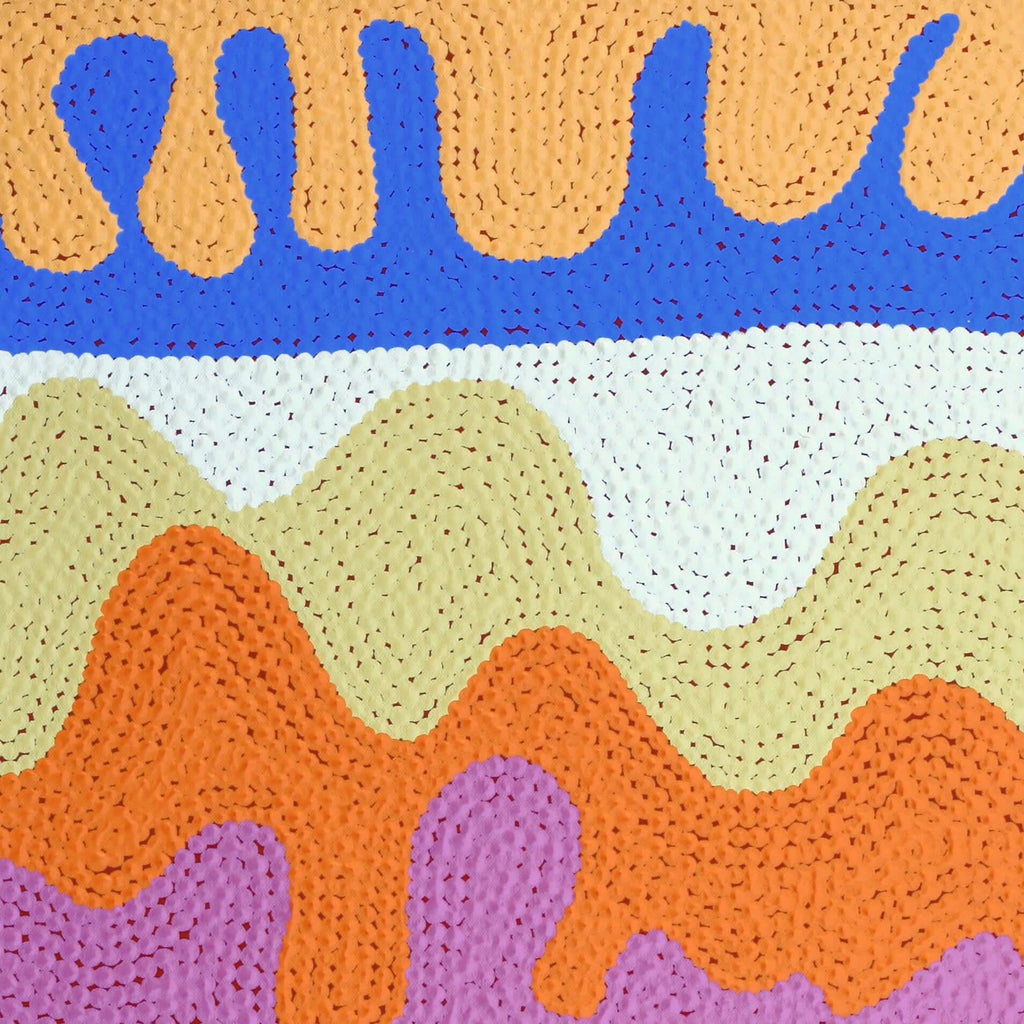Dans ce tableau, Benisa raconte l'histoire d'un grand trou rocheux dans les dunes de son pays, Kalipinpa. Kalipinpa est situé à 400 km à l’ouest d’Alice Springs, près de Kintore. C'est le pays du père de Benisa. C'est à Kalipinpa que vous assisterez à un bain sacré. Ce trempage est très important pour Benisa's Dreaming.