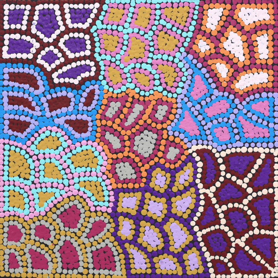Jerusha Nungarrayi Morris, Lukarrara Jukurrpa (Rêve de graines de jonc à franges du désert), 30x30cm