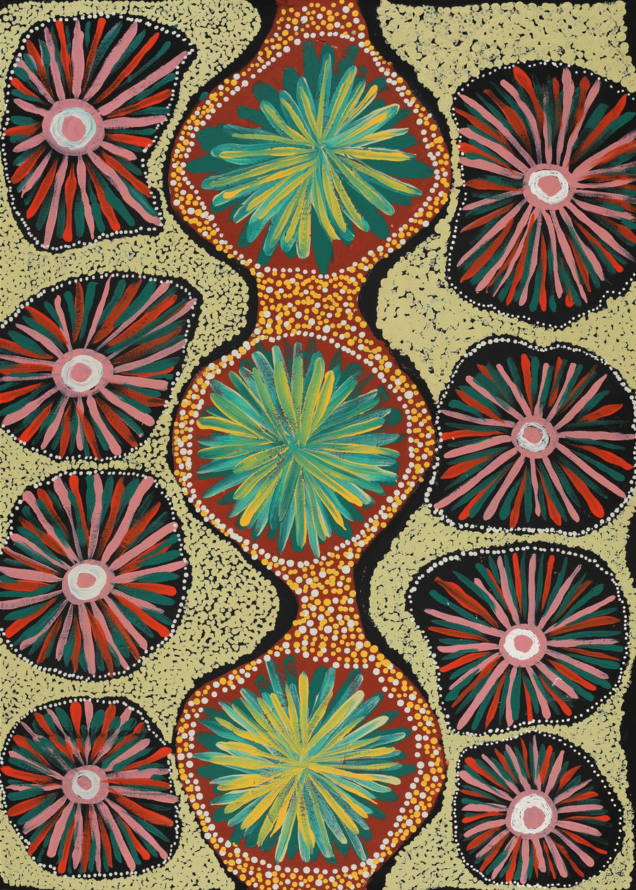 Kanytjupai peint les fleurs dont elle se souvient du printemps à Ernabella, où de nombreuses fleurs fleurissent dans la campagne. Kanytjupai utilise des couleurs vives et audacieuses pour décrire le paysage désertique des terres APY où elle a grandi.