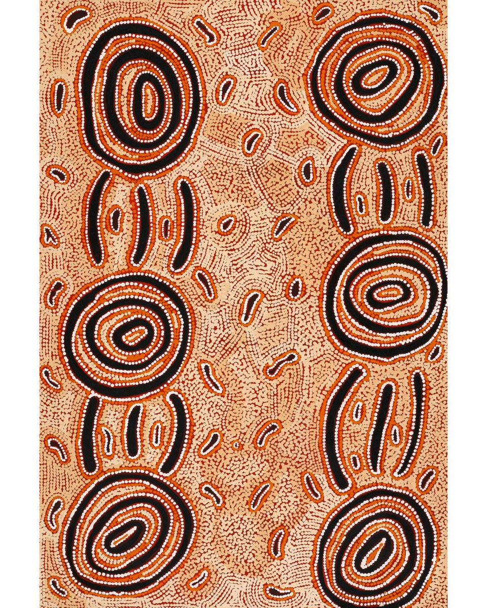 Le lieu représenté sur ce tableau, Ngama, se situe au sud de Yuendumu, dans le Territoire du Nord. Ce Rêve appartient aux femmes Nakamarra/Napurrurla et aux hommes Jakamarra/Jupurrurla. Ce récit décrit le voyage de Yarripiri, un « warna » (serpent) ancestral. Il voyagea de Wirnparrku, près du mont Liebig, jusqu'à Yimparlu, puis traversa les territoires de Ngapanangka-jarra, Warlajirryi, Kurnmundu et Yinyirrinyi jusqu'à Ngama. Plus tard, Yarripiri voyagea plus au nord, via Mijirlparnta (Mission Creek), jusqu'à l'extrémité nord de l'Australie. Yarripiri était très triste d'avoir été abandonné par sa famille à Wirnparrku. Aveugle et infirme, il était déterminé à les suivre et à les retrouver. Il fallut le porter. C'était la tâche accomplie par la « kurdungurlu » (police cérémonielle) du Rêve : les femmes Nangala/Nampijinpa et les hommes Jangala/Jampijinpa. Là où la queue de Yarripiri s'affaissait et touchait le sol, des ruisseaux se formaient, comme Mijirlparnta, à l'ouest de Yuendumu. Les traces et sentiers de Yarripiri sont souvent représentés par des arcs ou des lignes courbes sur la toile.