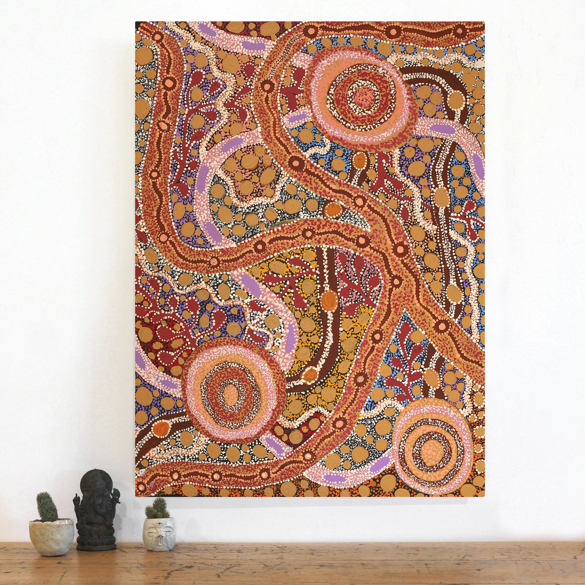Toutes les peintures sont accompagnées d'un certificat d'authenticité fourni par le Centre d'art autochtone géré par la communauté, et non par nous, qui est la référence en matière d'achat et de documentation éthiques.