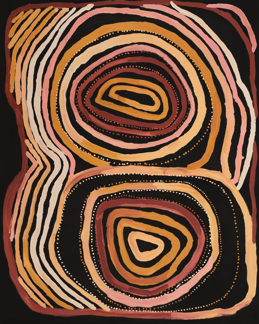 Cette œuvre provient d’Iwiṟi Arts, une organisation dirigée par des Aṉangu à Adélaïde, fondée par des Aṉangu ayant quitté des communautés isolées en raison du manque de services et de soins. Le studio soutient les artistes venant des APY Lands afin de maintenir le lien avec le Country, la langue et le Tjukurpa.