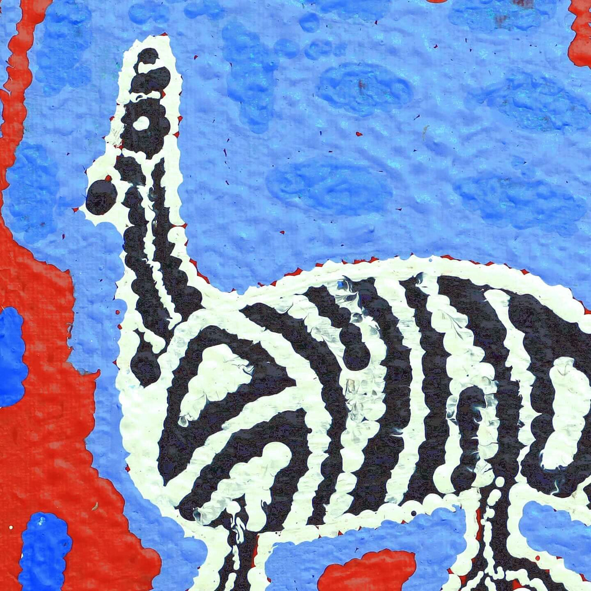 This particular site of the Yankirri Jukurrpa, (emu Dreaming [Dromaius novaehollandiae]) is at Ngarlikurlangu, north of Yuendumu. The ‘yankirri’ travelled to the rockhole at Ngarlikurlangu to find water. This Jukurrpa story belongs to Jangala/Jampijinpa men and Nangala/Nampijinpa women. In contemporary Warlpiri paintings traditional iconography is used to represent the Jukurrpa, associated sites and other elements. Emus are usually represented by their ‘wirliya’ (footprints), arrow-like shapes that show them walking around Ngarlikurlangu eating ‘yakajirri’ (bush raisin [Solanum centrale]). In the time of the Jukurrpa there was a fight at Ngarlikiurlangu between a ‘yankirri’ ancestor and Wardilyka (Australian bustard [Ardeotis australis]) ancestors over sharing the ‘yakajirri’. There is also a dance for this Jukurrpa that is performed during initiation ceremonies.