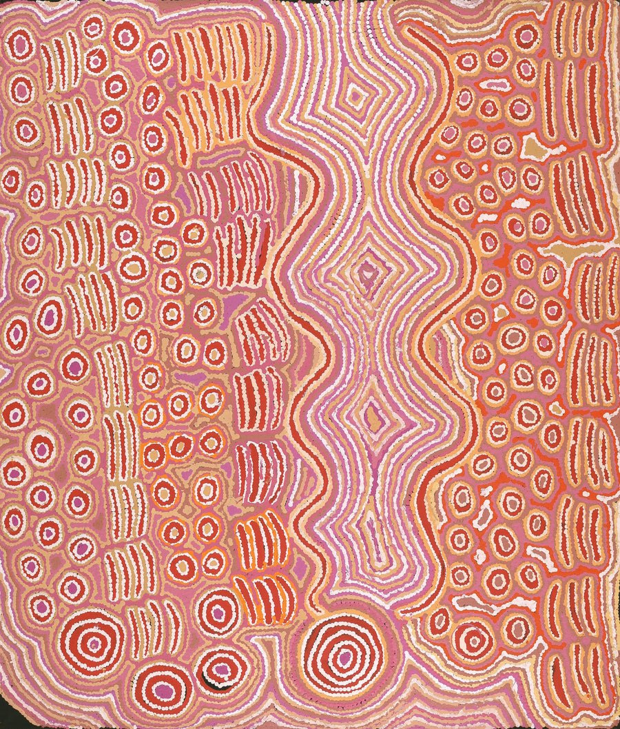 The subject of this work is Lappi Lappi, a rock hole near Lake Hazlett, about 90 km northwest of Lake Mackay in Western Australia. The country belongs to Nampijinpa/Jampijinpa and Nangala/Jangala skin groups. Located in a sheltered basin, the rock hole at Lappi Lappi is a permanent source of water, and is surrounded by country rich in bush tucker. In the time of the Jukurrpa (Dreamtime) many mothers with young children would gather there because it was a safe place to stay. The rock hole at Lappi Lappi is home to a ‘warnayarra’, a rainbow serpent that travels underground between various rock holes. One day, women were gathered at the rock hole with their children, singing and dancing. When the ‘warnayarra’ heard the sound of voices, it travelled silently towards them, under the water. When it reached the edge of the rock hole, it rose out of the water and ate them all.