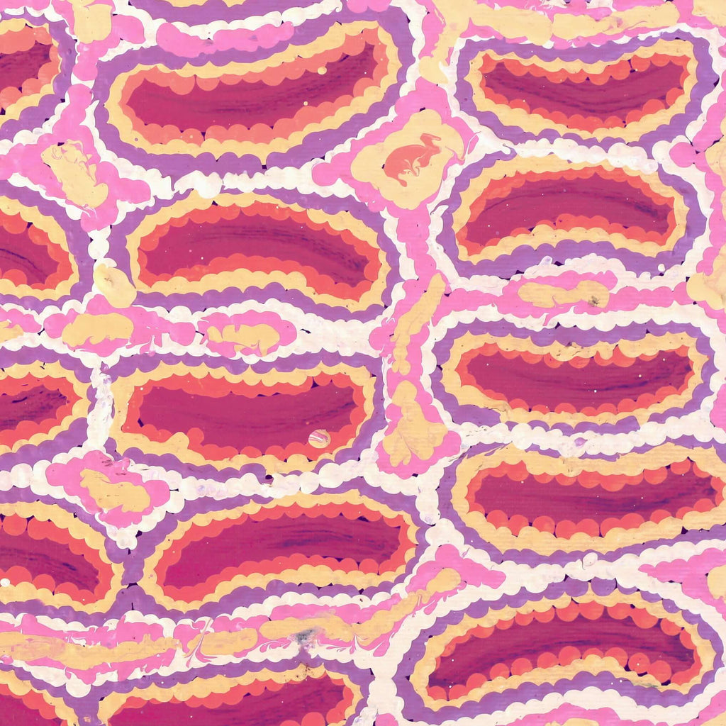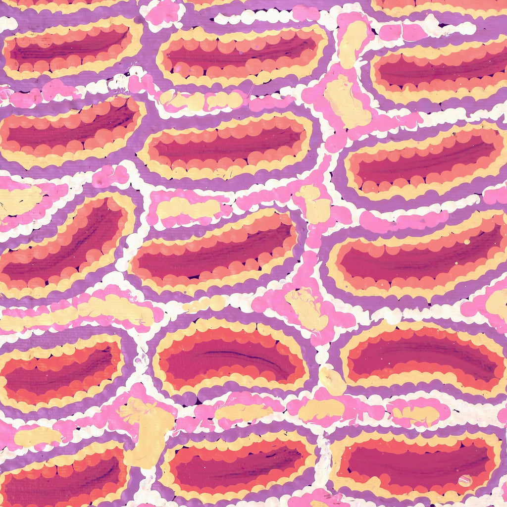 The subject of this work is Lappi Lappi, a rock hole near Lake Hazlett, about 90 km northwest of Lake Mackay in Western Australia. The country belongs to Nampijinpa/Jampijinpa and Nangala/Jangala skin groups. Located in a sheltered basin, the rock hole at Lappi Lappi is a permanent source of water, and is surrounded by country rich in bush tucker. In the time of the Jukurrpa (Dreamtime) many mothers with young children would gather there because it was a safe place to stay. The rock hole at Lappi Lappi is home to a ‘warnayarra’, a rainbow serpent that travels underground between various rock holes. One day, women were gathered at the rock hole with their children, singing and dancing. When the ‘warnayarra’ heard the sound of voices, it travelled silently towards them, under the water. When it reached the edge of the rock hole, it rose out of the water and ate them all.