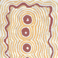 Alice was born in 1943 near Talaalpi, which is a swamp near and a little bit to the east of Walungurru on the Western Australian border. Prior to her painting Alice worked for many years at the Kintore School teaching the young girls dancing and the traditions of the desert people. Alice started painting on the “Minyama Tjukurrpa” – the Kintore Haasts Bluff collaborative canvas project. As a painter she is inspired by her rich cultural heritage, and thrives when involved with her stories and lore. Alice is an active “dancing woman” who travels widely to participate in annual ceremonies and “Women’s Law” meetings. Alice’s tjukurrpa is the porcupine or Tjilkamata. Her story is told in bright colours often utilizing orange and yellow to mirror the ochres that are used in ceremonial body painting. In her tjukurrpa story there is often the porcupine scurrying about rock holes and hiding places looking for tucker while nearby the women are themselves hunting, laying in wait for the porcupine. Alice is a keen hunter and likes to go hunting with Eunice Jack. Alice’s father was the late Uta Uta Tjangala, who was one of the original Papunya Tula painters. His Tjukurrpa is Pungkalungka at Takpalangu. Pungkalungka’s are dangerous, and sometimes kill and eat people. They live in huge caves in the hills. Alice only paints the entrance to the caves to signify the unknown danger of the monster that dwells within. Her father’s country is Ngurrapalangu, and her tjukurrpa has passed to her from this place – the porcupine was travelling through the sand hills and passing near the two carpet snakes, kuniya kutjarra, who were living underneath the water. Alice also enjoys the other crafts and is involved in producing hand-spindled hairstring for ceremonies and ininti necklaces and mats. She regularly goes out bush to collect ininti seeds then laboriously pierces them with hot wire to make beads for necklaces, bracelets or mats.