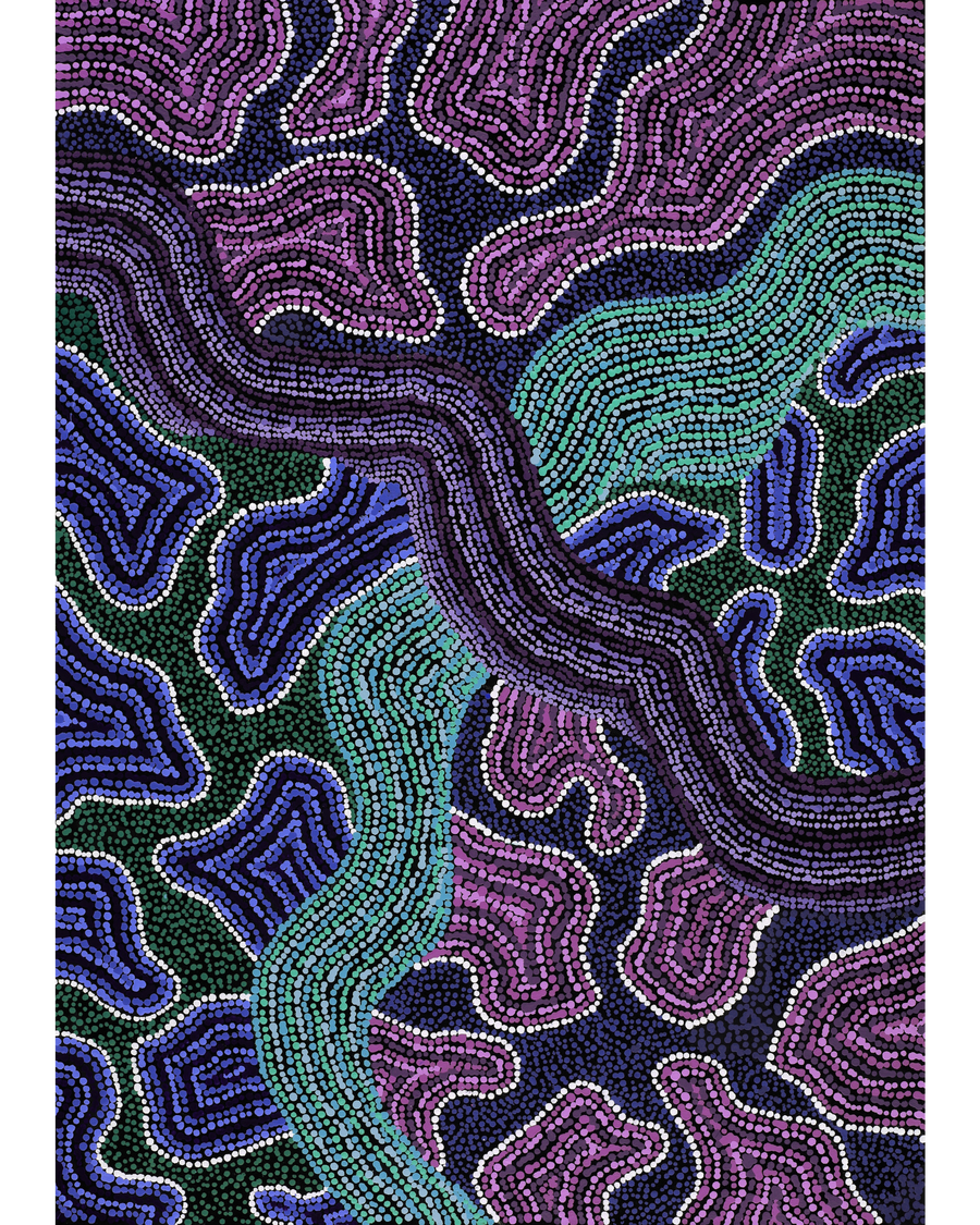 This artwork comes from Iwiṟi Arts, an Aṉangu-led organisation in Adelaide established by Aṉangu who had moved from remote communities due to limited services and chronic health needs. The studio supports artists visiting or living in the city from the APY Lands, helping maintain strong cultural connection to Country, language and Tjukurpa while away from homelands.
