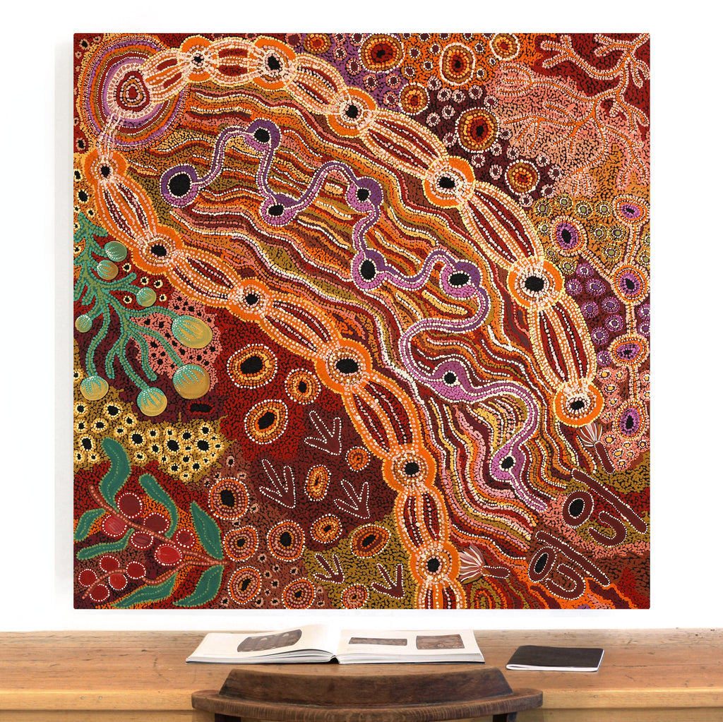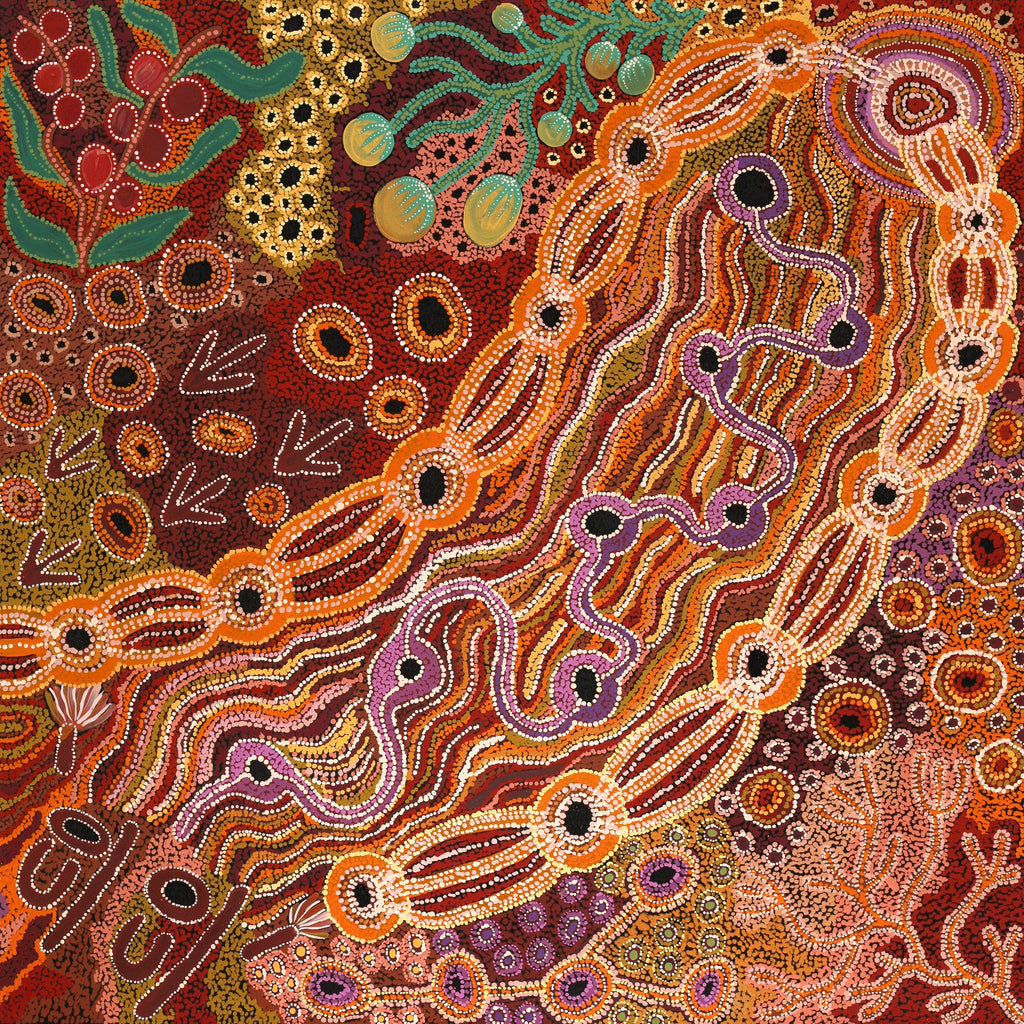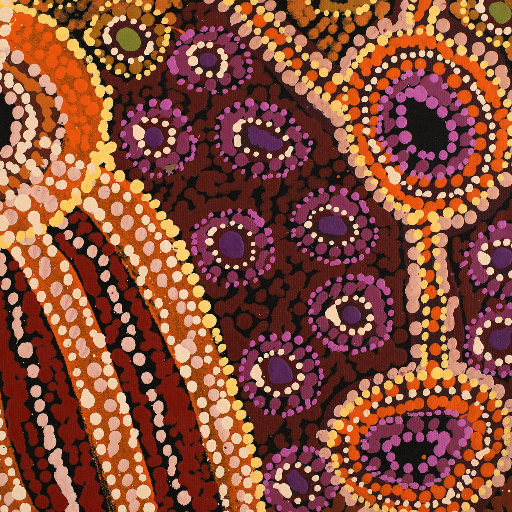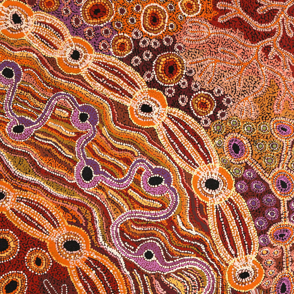 This painting is Ngura Nganampa (our home). Audrey grew up at Turkey bore just south of Ernabella in the Anangu Pitjantjatjara Yankunytjatjara lands. Turkey bore is Audrey's father's country and she paints this area from the old days, tracks from Anangu people traveling between different places along the Krarru (creek) and between the tjukula (waterholes). They are walking through the valley in the bush looking for bush foods, Mai tjuta, Kapi tjuta, plenty of good food and water here.