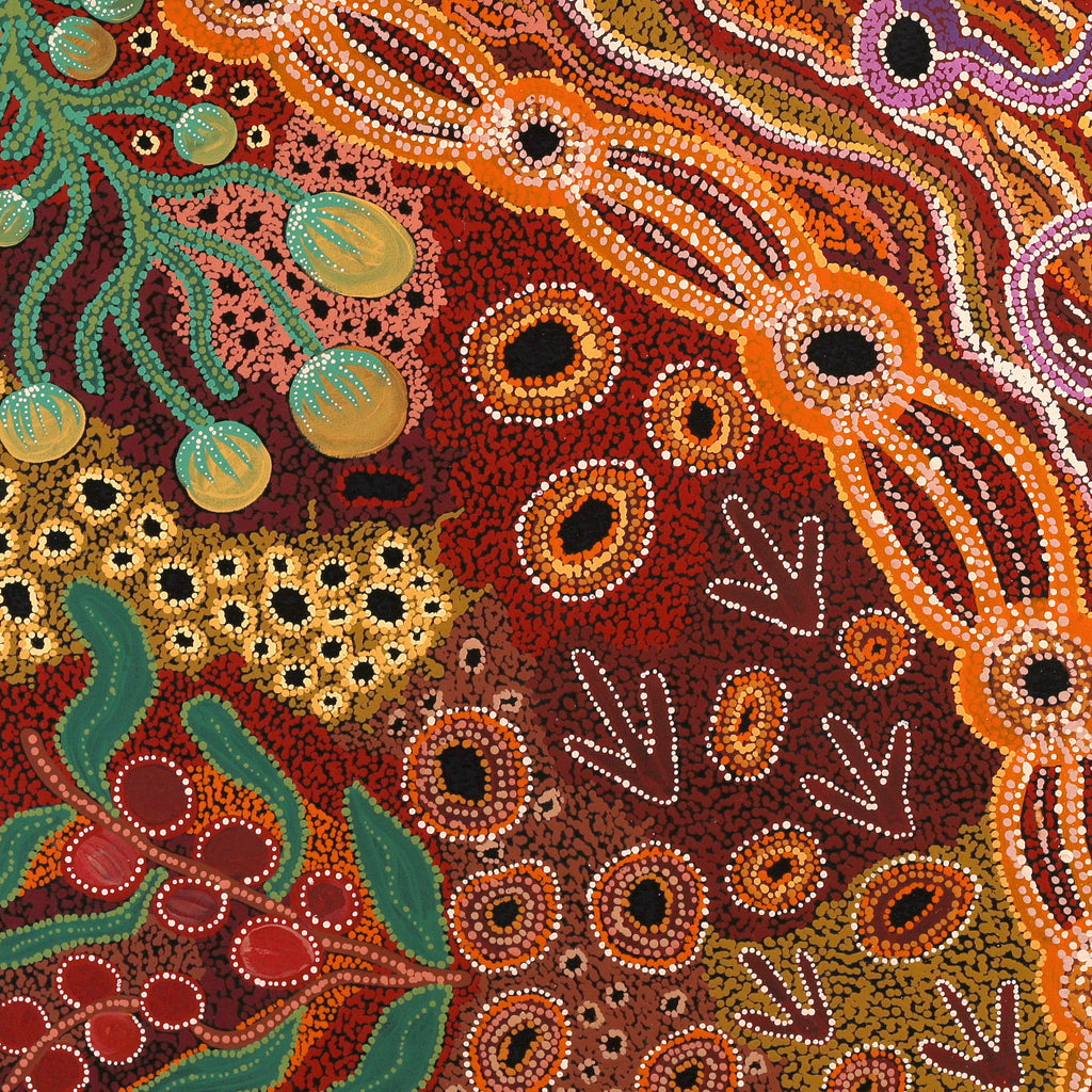 Audrey was born in Ernabella, South Australia in 1967. She was a school teacher there for many years and now resides in Adelaide, South Australia. The Brumby family are from the Pitjantjatjara people and lands and speak the Anangu language. Audrey has been part of the Ernabella art collective and can remember when they were taught batik techniques in the 1980s as part of a cultural exchange. Some of her work reflects this early experience with a canting. She has been a productive and passionate painter and has displayed work at Tandanya and has major works installed at the AEU building (SA), Australian Taxation Office (SA), the Adelaide Hilton (in 2017) and in 2014 the historic Brookman Hall, UNISA, Adelaide. Audrey actively works as a Pitjantjatjara translator and has also illustrated a series of children’s books written in both English and Pitjantjatjara language. Her work reflects dreaming, country-flora, travel through Pitjantjatjara Yankunytjatjara Lands and bush tucker.