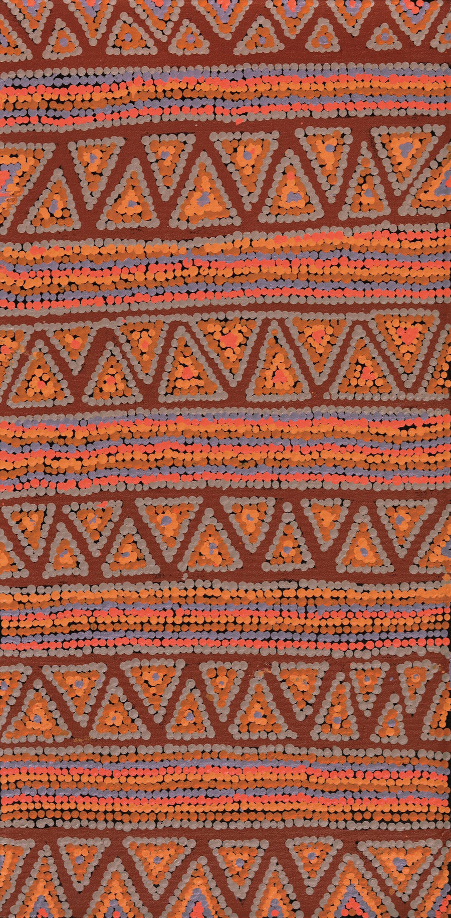 This painting depicts the natural landscape around Yuendumu. The bush around Yuendumu features plenty of ‘watiya’ (trees), ‘marna’ (grass), ‘kuyu’ (animals) to hunt, and ‘miyi’ (edible plants) to gather.