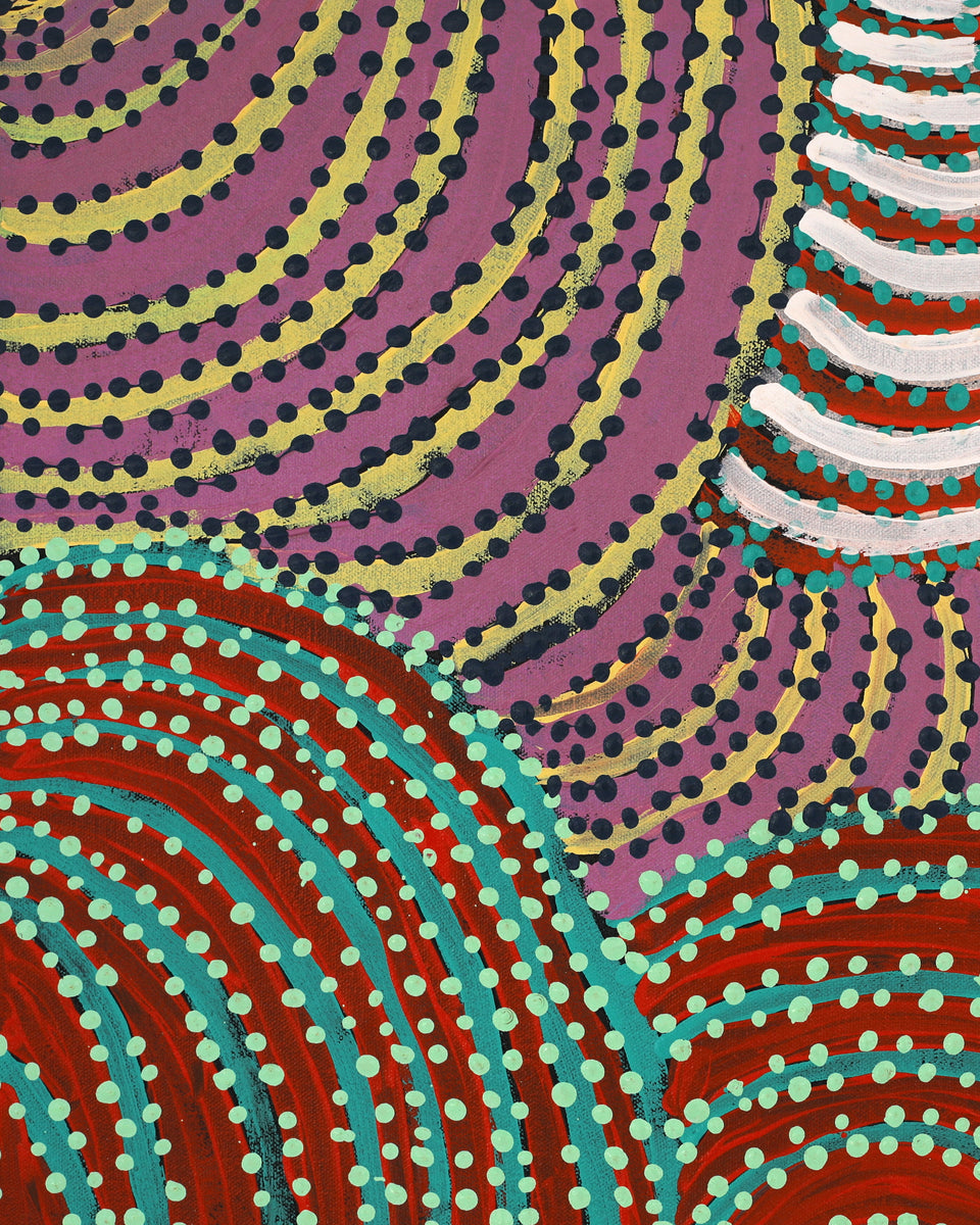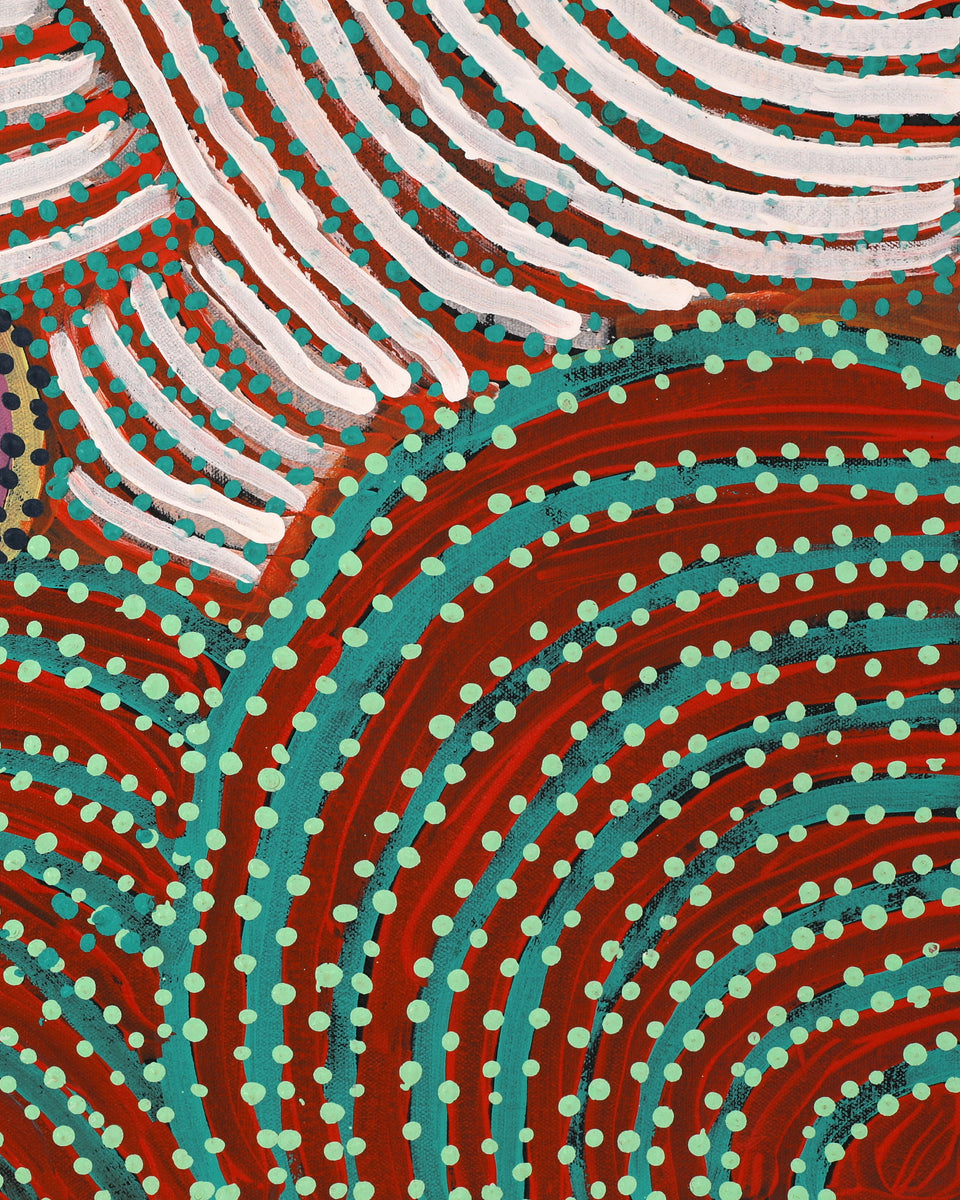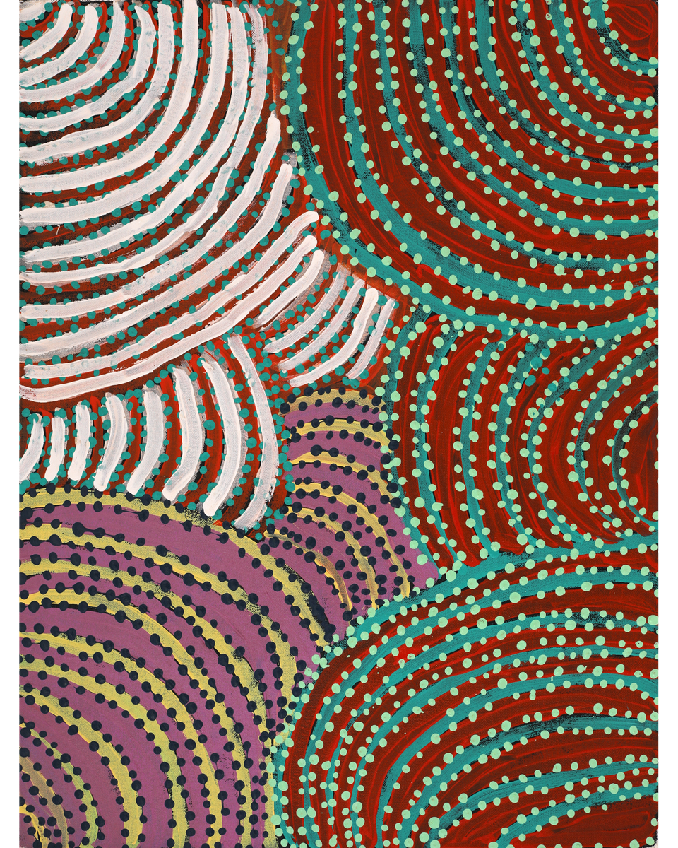 This work portrays an area of Country that can be interpreted in multiple ways. Firstly, the image may be read as an aerial representation of a particular location known to the artist — either land that they or their family travelled, from the pujiman (traditional, desert dwelling) era to now. During the pujiman period, Martu would traverse very large distances annually in small family groups, moving seasonally from water source to water source, and hunting and gathering bush tucker as they went. At this time, one’s survival depended on their intimate knowledge of the location of resources; thus physical elements of Country, such as sources of kapi (water), tali (sandhills), different varieties of warta (trees, vegetation), ngarrini (camps), and jina (tracks) are typically recorded with the use of a system of iconographic forms universally shared across the desert.