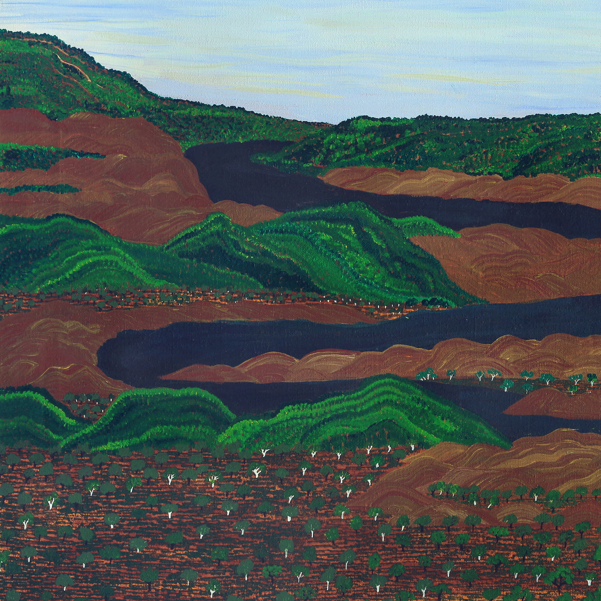 Her interpretations of country are painted in vivid acrylics onto the canvas – she shows us the changes in the seasons, the billabongs and rivers, and the way she sees the land around her.