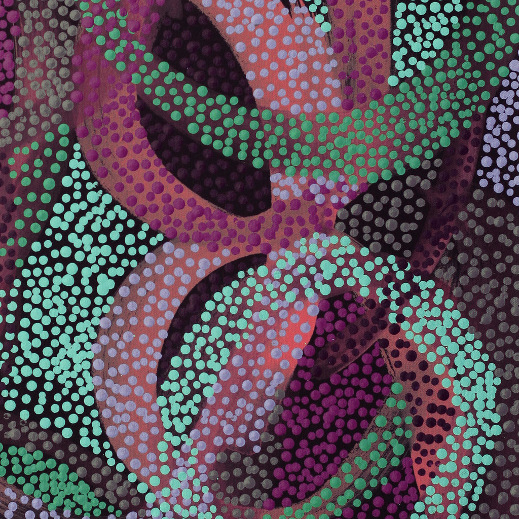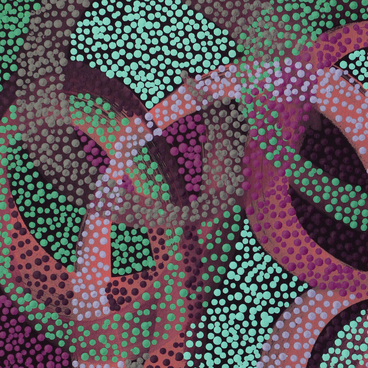 The site depicted in this painting is Puyurru, west of Yuendumu. In the usually dry creek beds are ‘mulju’ (soakages), or naturally occurring wells. The 'kirda' (owners) for this site are Nangala/Nampijinpa women and Jangala/Jampijinpa men. Two Jangala men, rainmakers, sang the rain, unleashing a giant storm. The storm travelled across the country from the east to the west, initially travelling with a ‘pamapardu Jukurrpa’ (termite Dreaming) from Warntungurru to Warlura, a waterhole 8 miles east of Yuendumu. At Warlura, a gecko called Yumariyumari blew the storm on to Lapurrukurra and Wilpiri. Bolts of lightning shot out at Wirnpa (also called Mardinymardinypa) and at Kanaralji. At this point the Dreaming track also includes the ‘kurdukurdu mangkurdu Jukurrpa’ (children of the clouds Dreaming). The water Dreaming built hills at Ngamangama using baby clouds and also stuck long pointy clouds into the ground at Jukajuka, where they can still be seen today as rock formations.