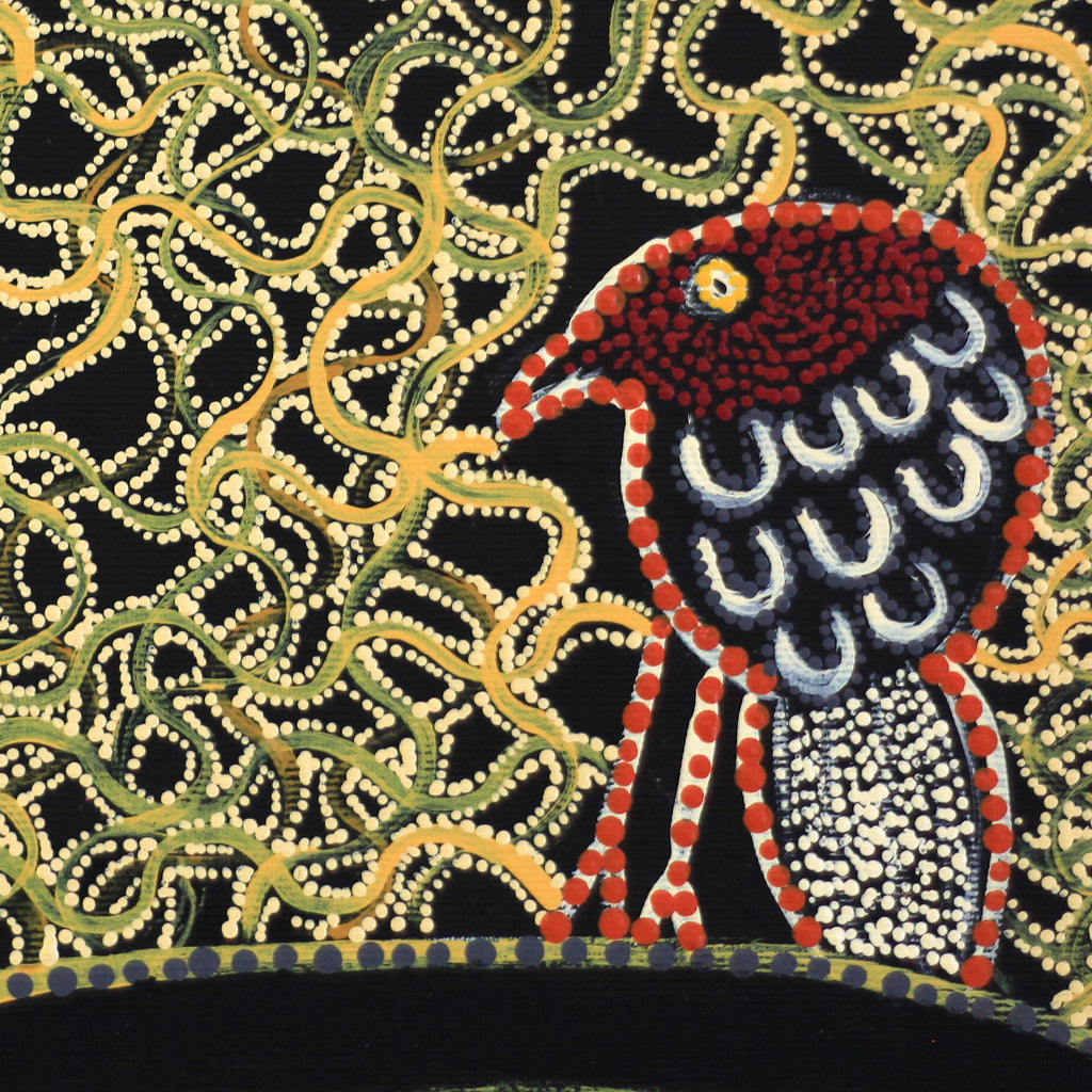 This painting depicts one of many ‘jurlpu’ (bird) species that live around Yuendumu. The bush around Yuendumu provides many different habitats for birds to live in. Many bird species live around waterholes and rivers, like the ‘pirniny-pirninypa’ (black fronted dotterel [Elseyornis melanops]). Others live in the spinifex country, like the ‘nuwiyingki’ or ‘panngarra’ (cockatiel [Nymphicus hollandicus]). Still others make nests in trees, like the ‘juwayikirdi’ (grey crowned babbler [Pomatostomus temporalis]).
