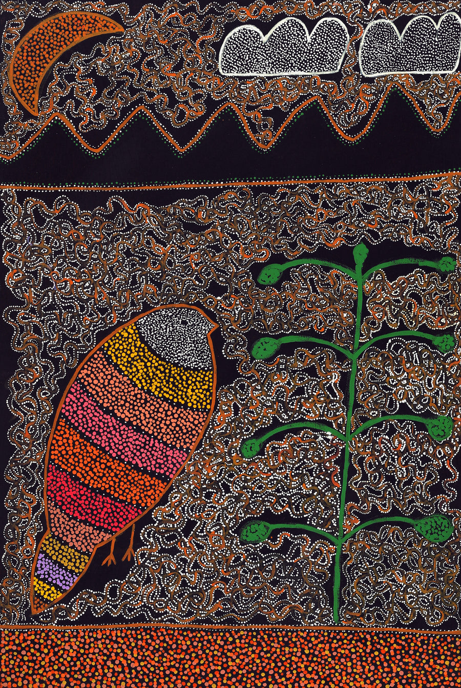 This painting depicts one of many ‘jurlpu’ (bird) species that live around Yuendumu. The bush around Yuendumu provides many different habitats for birds to live in. Many bird species live around waterholes and rivers, like the ‘pirniny-pirninypa’ (black fronted dotterel [Elseyornis melanops]) and Ngatijirri (budgerigar [Melopsittacus undulates]). Others live in the spinifex country, like the ‘nuwiyingki’ or ‘panngarra’ (cockatiel [Nymphicus hollandicus]). Still others make nests in trees, like the ‘juwayikirdi’ (grey crowned babbler [Pomatostomus temporalis]).