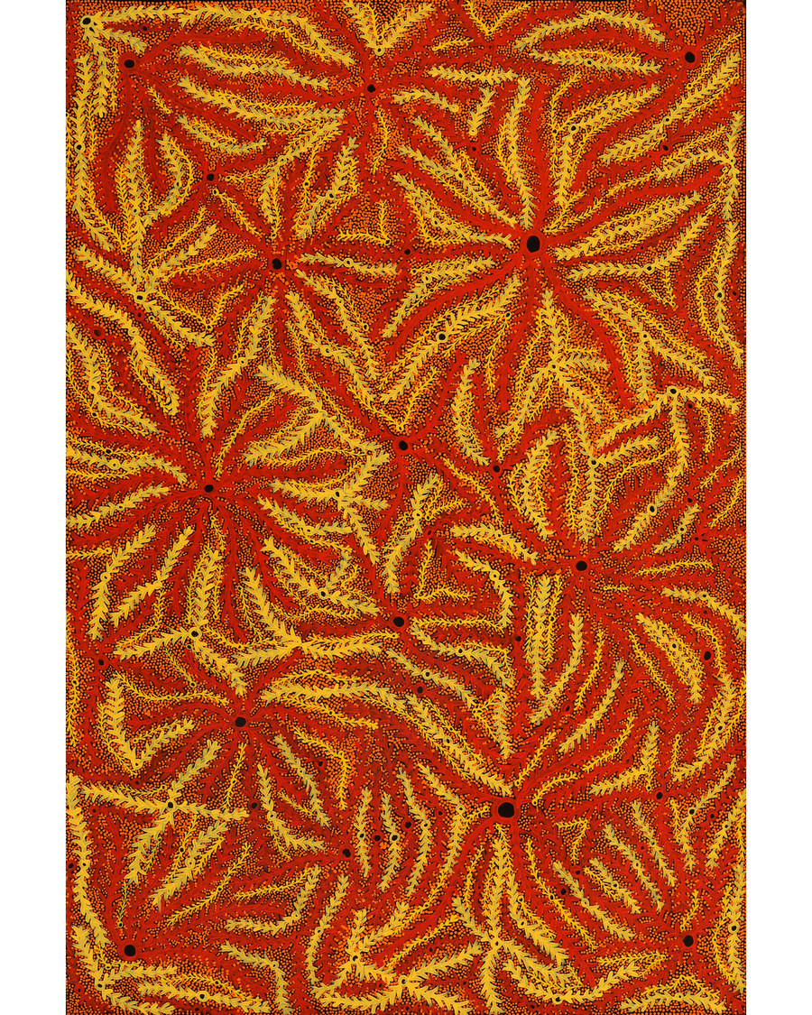 Geraldine began painting with the Warlukurlangu Artists Aboriginal Corporation, an Aboriginal owned and governed art centre located in Yuendumu, in 1996. She paints her father’s Janganpa Jukurrpa (Bushtail Possum) – Mawurrji; Lukarrara Jukurrpa (Desert Fringe-rush Seed Dreaming) and Yarla Jukurrpa (Bush Potato Dreaming), ‘dreamings’ related directly to her land, its features and the plants and animals that inhabit it. These stories have been passed down by her father and his father, through the generations for millennia. “When I’m sitting down painting my ‘dreamings’, I feel contented. My ‘dreamings’ make me happy.” Geraldine likes working with colour and patterns and uses an unrestricted palette to develop a modern interpretation of her traditional culture.