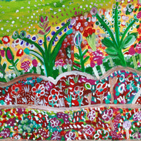 Like Gertie Huddleston and Maureen Thompson, women painters from Ngukurr who came before her, Gwenneth’s paintings are rich, detailed tapestries of luminous acrylic paint on canvas.