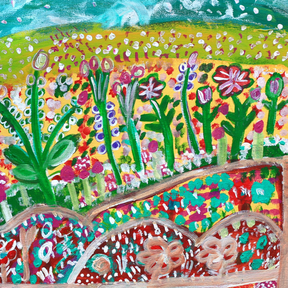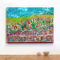 Before she starts painting Gwenneth closes her eyes, conjures a picture in her mind’s eye, then uses soft pinks, vivid greens and flashes of gold to depict how beautiful and alive her country is.