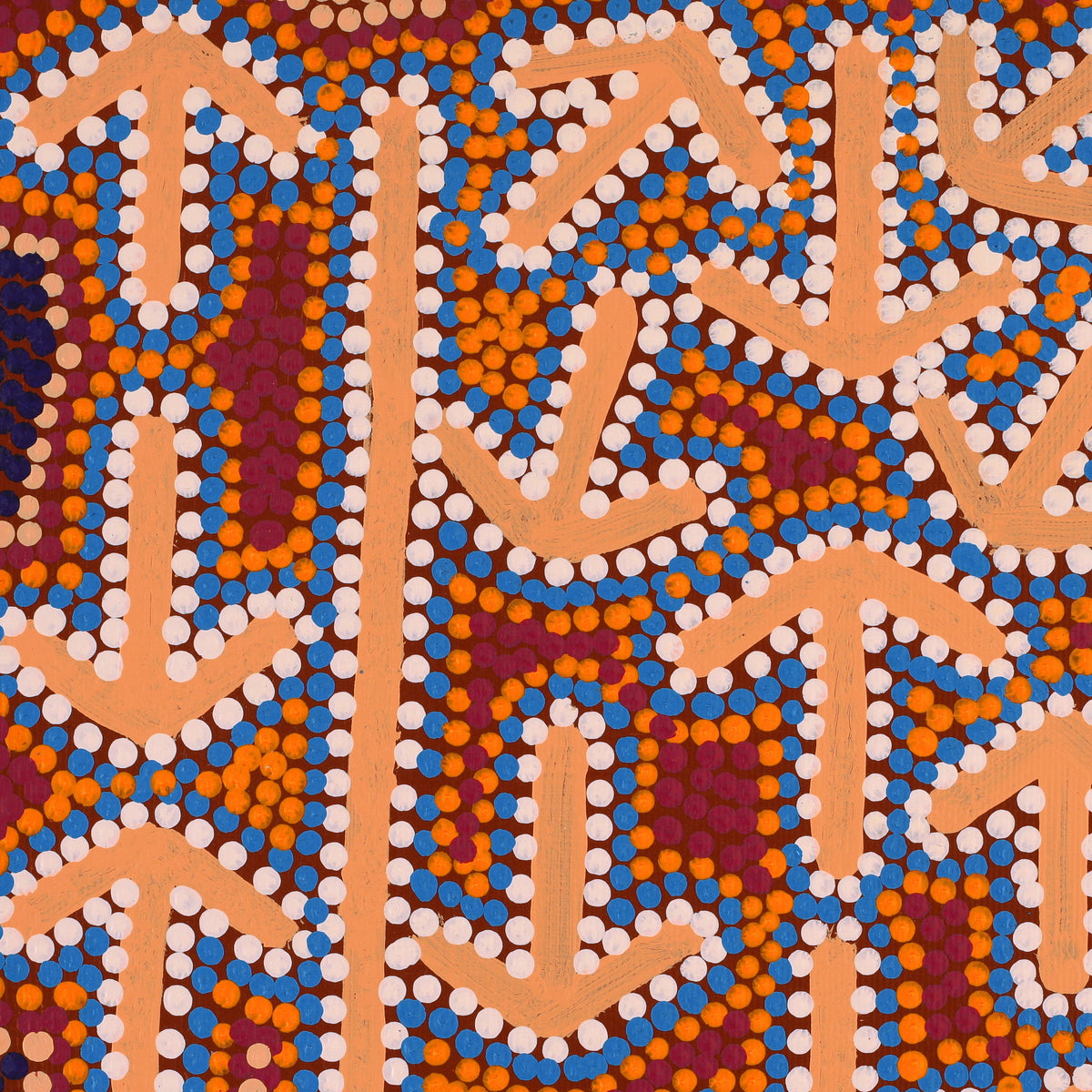 In contemporary Warlpiri paintings, traditional iconography can be used to represent the Jukurrpa, associated sites, and other elements. ‘Yankirri’ are usually represented by arrow-like shapes depicting their ‘wirliya’ (footprints) as they walk around.