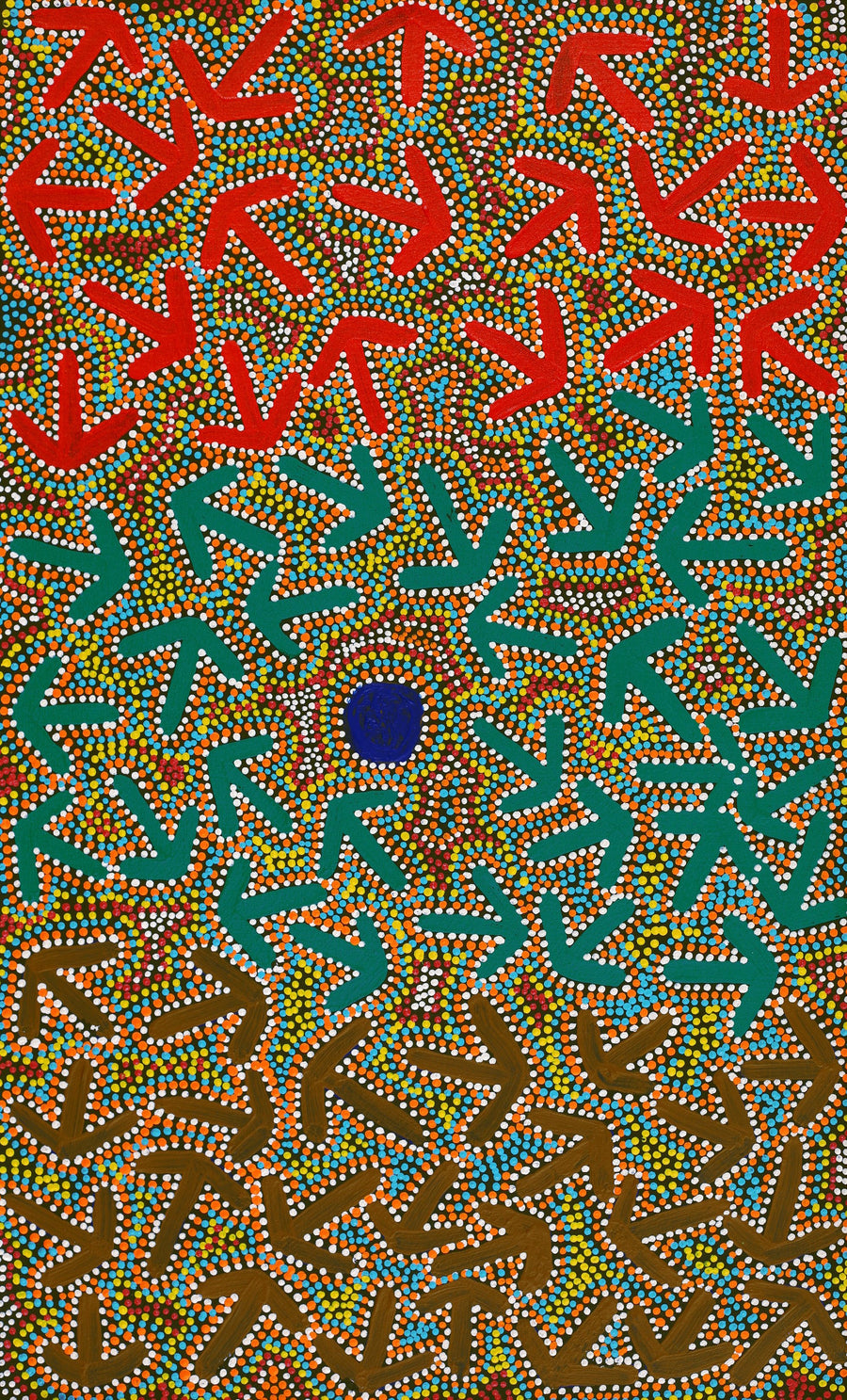 This particular site of the Yankirri Jukurrpa, (emu Dreaming [Dromaius novaehollandiae]) is at Ngarlikurlangu, north of Yuendumu. The ‘yankirri’ travelled to the rockhole at Ngarlikurlangu to find water. This Jukurrpa story belongs to Jangala/Jampijinpa men and Nangala/Nampijinpa women. In contemporary Warlpiri paintings traditional iconography is used to represent the Jukurrpa, associated sites and other elements. Emus are usually represented by their ‘wirliya’ (footprints), arrow-like shapes that show them walking around Ngarlikurlangu eating ‘yakajirri’ (bush raisin [Solanum centrale]). In the time of the Jukurrpa there was a fight at Ngarlikiurlangu between a ‘yankirri’ ancestor and Wardilyka (Australian bustard [Ardeotis australis]) ancestors over sharing the ‘yakajirri’. There is also a dance for this Jukurrpa that is performed during initiation ceremonies.