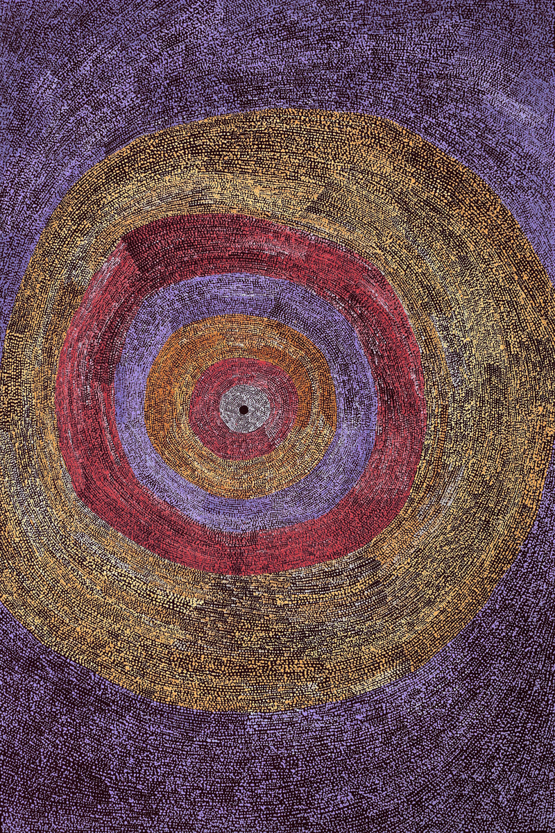 Usually an aerial perspective along with a more recently and established distinctive monochromatic pallette, Julie's current paintings (which depict the topographical features of her traditional country at the site of Pirlinyanu) have become works of extraordinary optical brilliance as she alternates the size of dots throughout her work as well as building up specific shapes or reference points often repeated with overdotting.