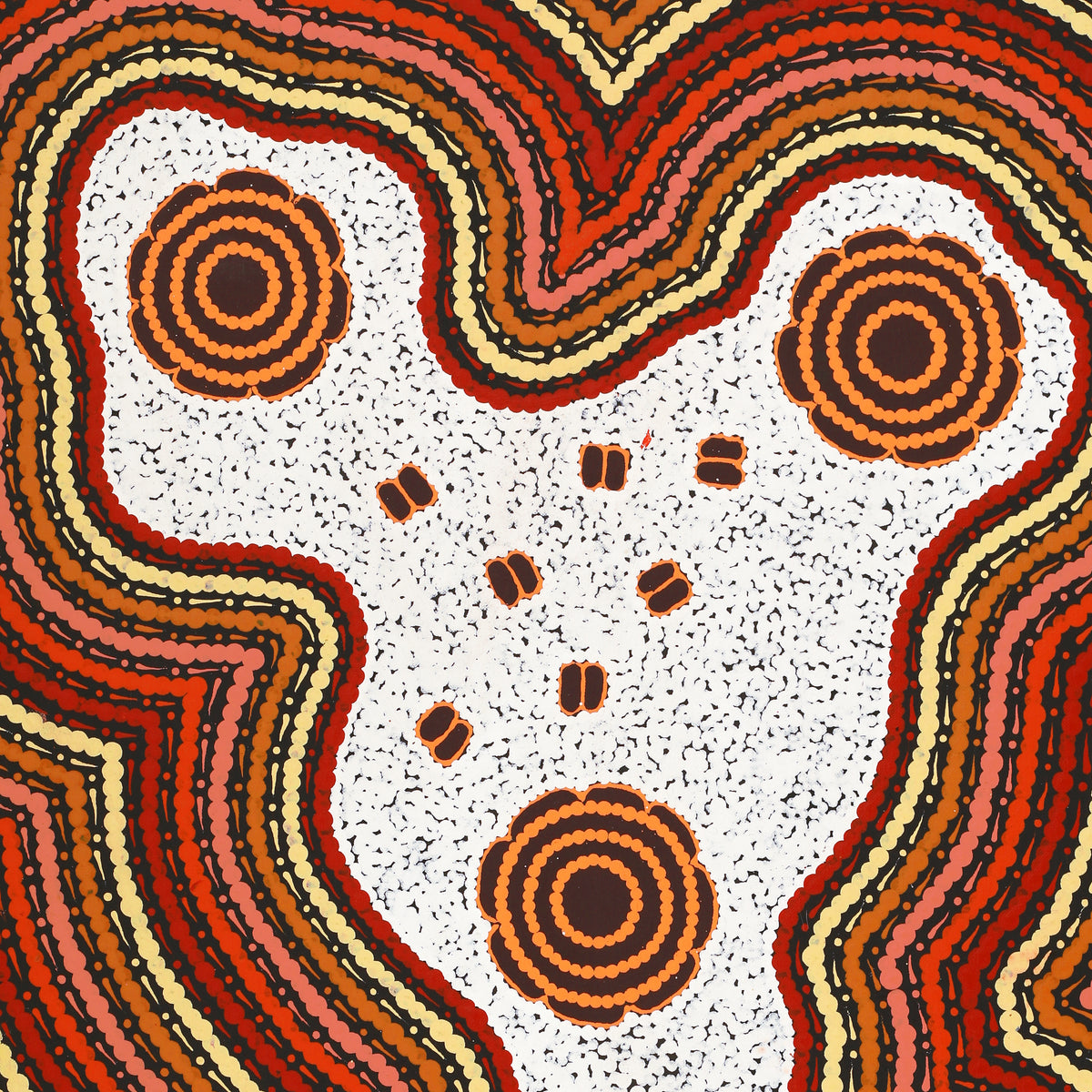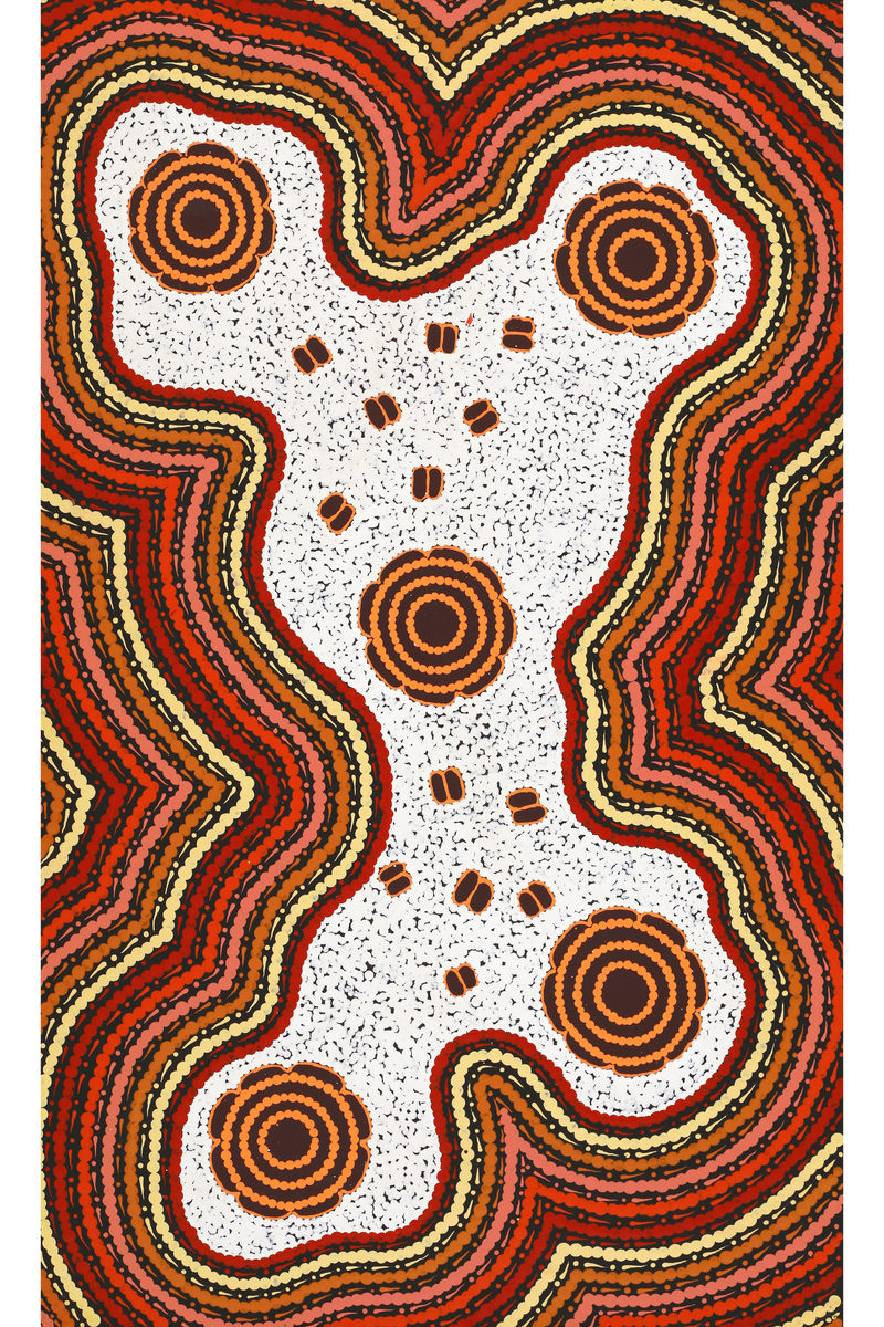 This painting depicts the Pamapardu Jukurrpa (Flying Ant Dreaming) from Wapurtali, west of Yuendumu. 'Pamapardu' is the Warlpiri name for the flying ants or termites that build the large anthills found throughout Warlpiri country. This country belongs to Nakamarra/Napurrurla women and Jakamarra/Jupurrurla men. 'Pamapardu' are flying ants. They build earth mounds (‘mingkirri’) that are common in the Tanami area. When heavy rains come in summer the ‘mingkirri’ get flooded out, so the ‘pamapardu’ grow wings and fly off to make new homes, following their queens to dry mounds or to build a new. When they have found their new home they drop their wings. In this stage they can be collected, lightly cooked in coals and eaten. As they fall to the ground women collect them to eat because they are nice and sweet. In contemporary Warlpiri paintings traditional iconography is used to represent the Jukurrpa, particular sites and other elements. When this Jukurrpa story is painted concentric circles are used to represent the ‘mingkirri’ and the rockholes involved in the story, including the central one at Wapurtali (Mt Singleton). Dashes are often depicted around the circles to represent the ‘pamapardu’.