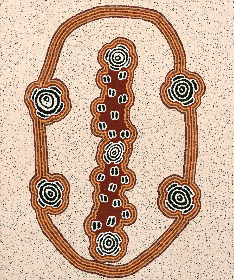 This painting depicts the Pamapardu Jukurrpa (Flying Ant Dreaming) from Wapurtali, west of Yuendumu. 'Pamapardu' is the Warlpiri name for the flying ants or termites that build the large anthills found throughout Warlpiri country. This country belongs to Nakamarra/Napurrurla women and Jakamarra/Jupurrurla men. 'Pamapardu' are flying ants. They build earth mounds (‘mingkirri’) that are common in the Tanami area. When heavy rains come in summer the ‘mingkirri’ get flooded out, so the ‘pamapardu’ grow wings and fly off to make new homes, following their queens to dry mounds or to build a new. When they have found their new home they drop their wings. In this stage they can be collected, lightly cooked in coals and eaten. As they fall to the ground women collect them to eat because they are nice and sweet. In contemporary Warlpiri paintings traditional iconography is used to represent the Jukurrpa, particular sites and other elements. When this Jukurrpa story is painted concentric circles are used to represent the ‘mingkirri’ and the rockholes involved in the story, including the central one at Wapurtali (Mt Singleton). Dashes are often depicted around the circles to represent the ‘pamapardu’.