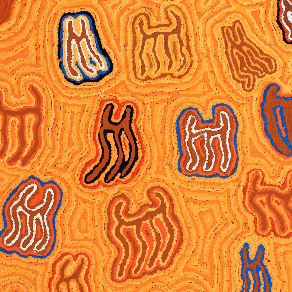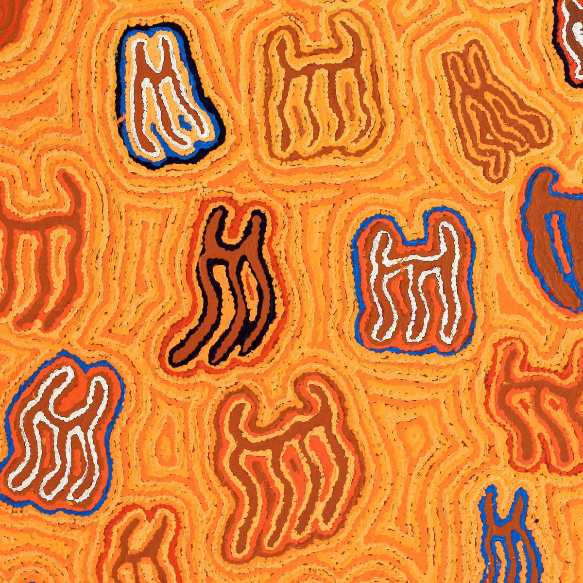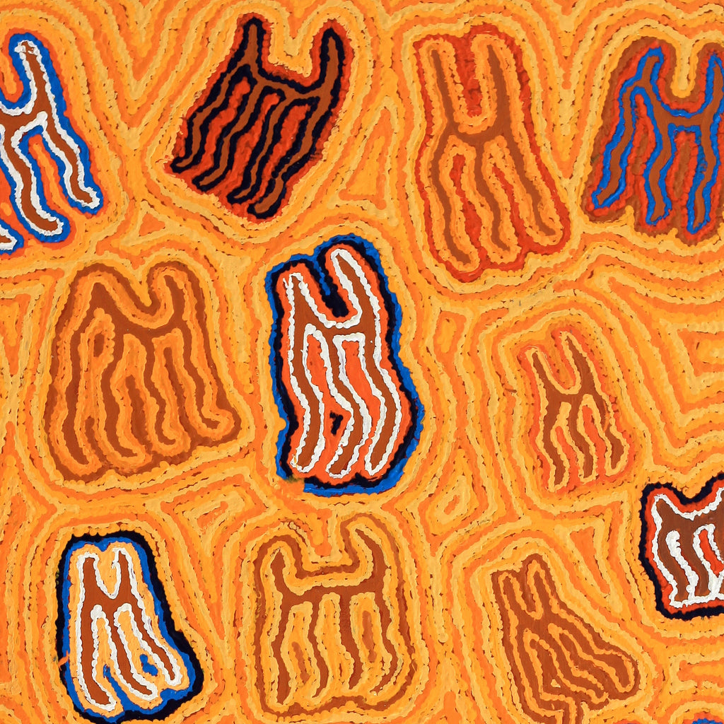 This painting is of the Majardi Jukurrpa (hair-string belt or tassel Dreaming). Majardi is a belt or pubic tassel made of ‘purdurru’ (spun hair or fur) worn during traditional ceremonies. Human hair (and sometimes the fur from wallabies or possums) is rolled on the thigh and then spun using a ‘wirinkirri’ (stick spindle). The string is then incorporated into a skirt or pubic tassel that is worn by men or women while dancing during ceremonies. In the time of the Jukurrpa, ancestral hero women of the Napangardi and Napanangka kinship subsections were living at Mina-Mina, a site of great religious significance far to the west of Yuendumu. The women travelled over their country performing ceremonies and dances wearing their ‘majardi’. This Dreaming belongs to the women of the Napangardi/Napanangka subsections and to their classificatory brothers, the Japangardi/Japanangka men.