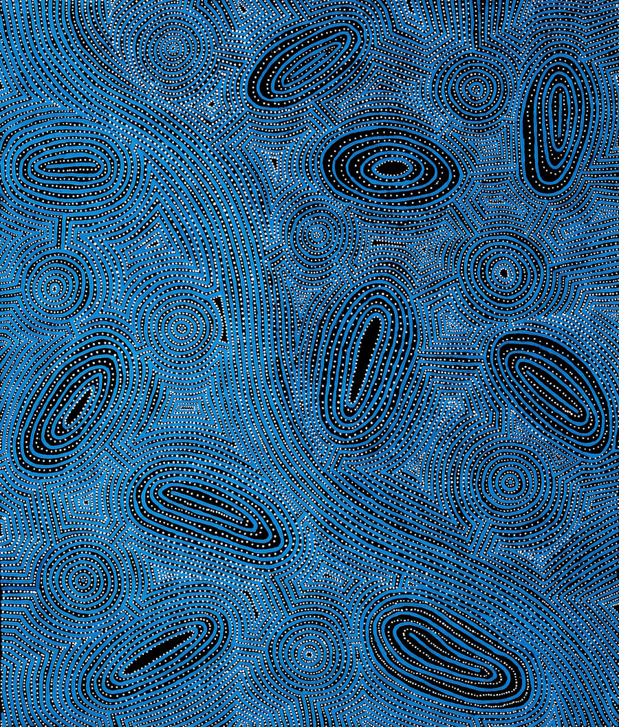 The site depicted in this painting is Pirlinyarnu (Mt. Farewell), about 165 km west of Yuendumu in the Northern Territory. The ‘kirda’ (owners) for the water Dreaming site at Pirlinyarnu are Nangala/Nampijinpa women and Jangala/Jampijinpa men.