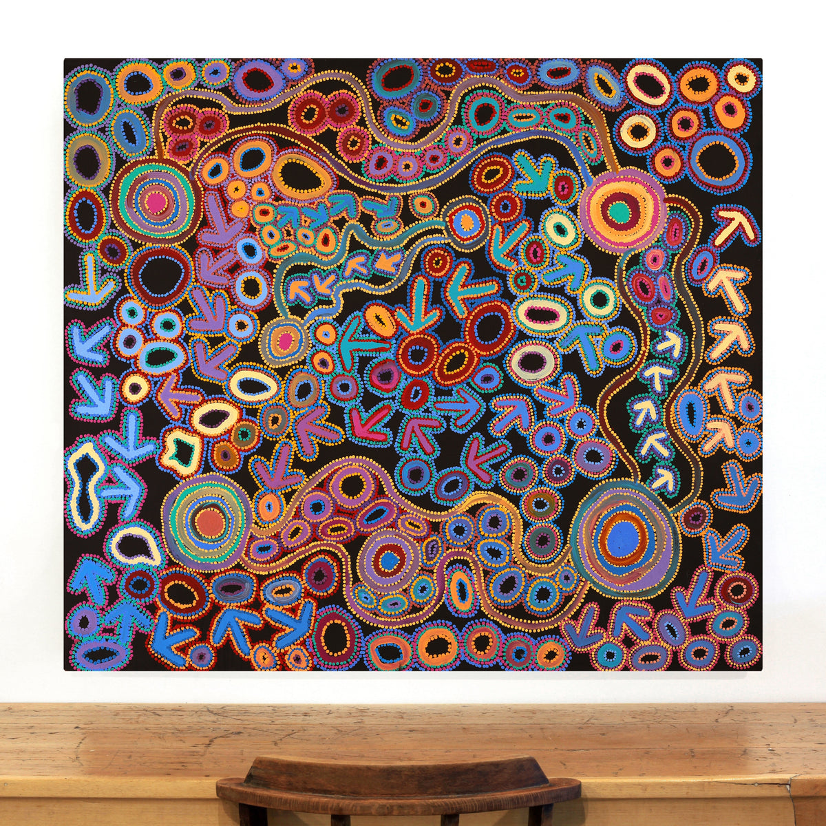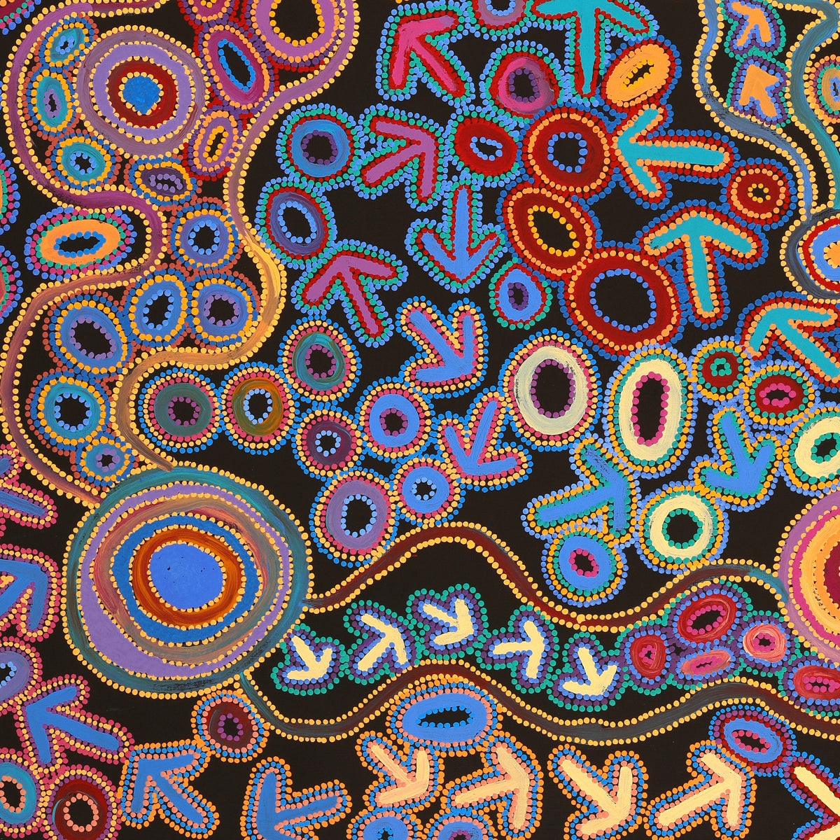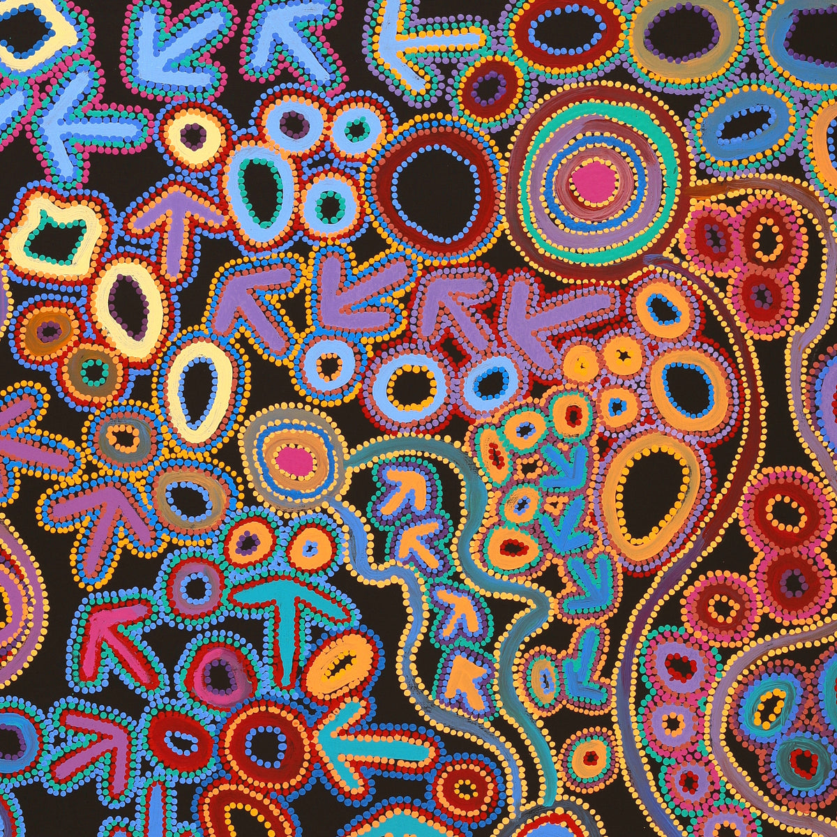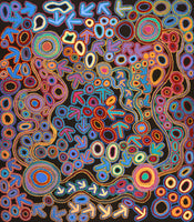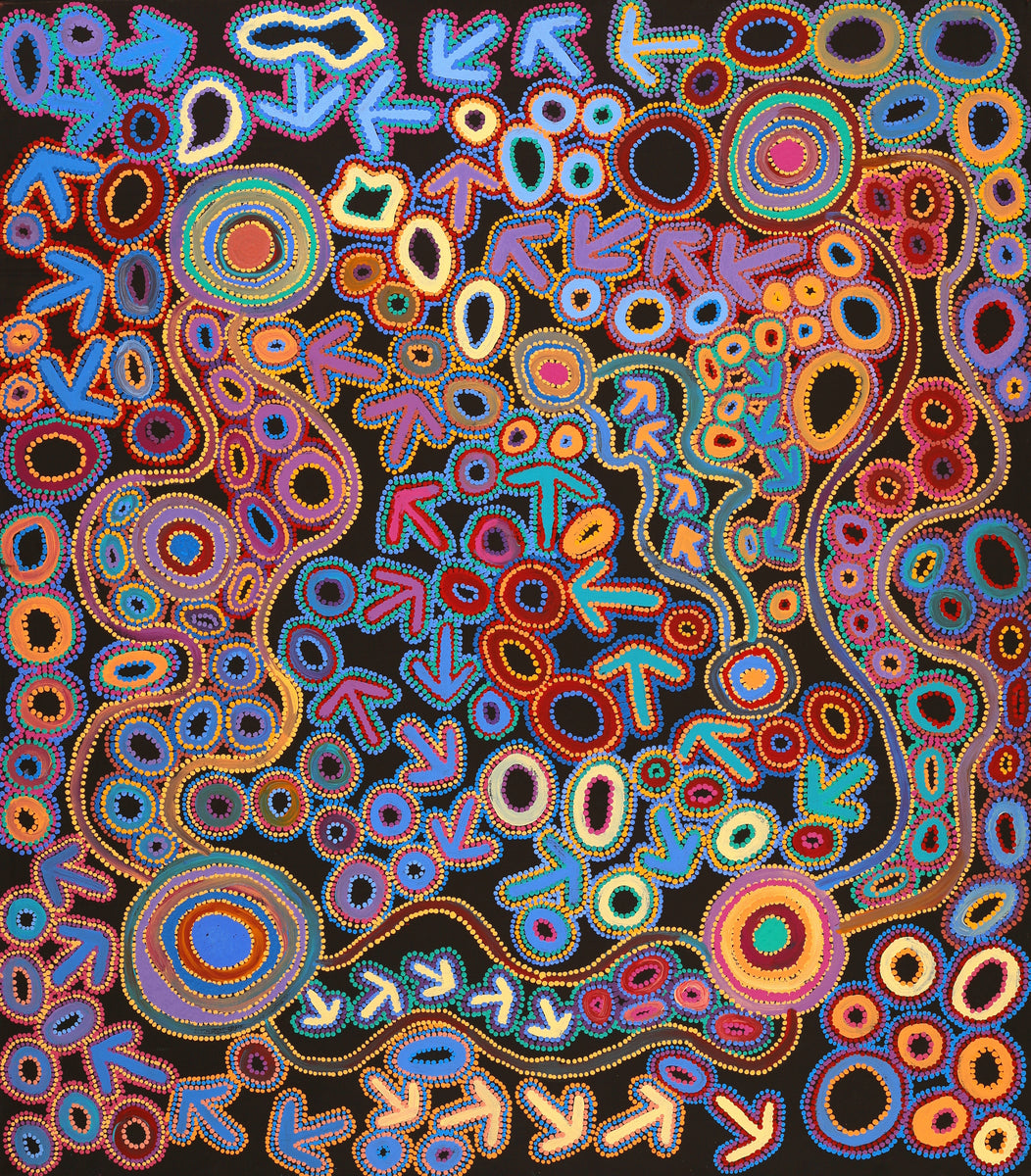 This particular site of the Yankirri Jukurrpa, (emu Dreaming [Dromaius novaehollandiae]) is at Ngarlikurlangu, north of Yuendumu. The ‘yankirri’ travelled to the rockhole at Ngarlikurlangu to find water. This Jukurrpa story belongs to Jangala/Jampijinpa men and Nangala/Nampijinpa women.In contemporary Warlpiri paintings traditional iconography is used to represent the Jukurrpa, associated sites and other elements. Emus are usually represented by their ‘wirliya’ (footprints), arrow-like shapes that show them walking around Ngarlikurlangu eating ‘yakajirri’ (bush raisin [Solanum centrale]). In the time of the Jukurrpa there was a fight at Ngarlikiurlangu between a ‘yankirri’ ancestor and Wardilyka (Australian bustard [Ardeotis australis]) ancestors over sharing the ‘yakajirri’. There is also a dance for this Jukurrpa that is performed during initiation ceremonies.