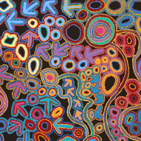 ”I find painting very contemplative.” Lee Nangala Wayne/Gallagher was born in 1958 in Yuendumu, a remote Aboriginal community 290 km north-west of Alice Springs in the NT of Australia. She lived most of her life in Yuendumu, but when her husband passed away in 2003 she moved to Nyirripi, a further 160 km west of Yuendumu, where her mother still lives. Nyirripi is her father’s country and her mother is Mary Napangardi Gallagher, a well-known artist who also paints with Warlukurlangu Artists. Lee has one sister and three brothers. She has three children, two sons and one daughter and one adopted child from her younger sister. She has lots of grandkids. Lee went to Yuendumu School and after completing school she worked for the Central Desert Shire (CDS) Council Trust, cooking for the aged care. She has been painting with Warlukurlangu Artists Aboriginal Corporation, an Aboriginal owned and governed art centre in Yuendumu since 2006. She began painting after “watching all those old people doing painting”. She says she feels better when she’s painting. Lee paints her father’s Jukurrpa stories, Dreamings that relate directly to her father’s land, its features and the plants and animals that inhabit it. These stories have been passed down for millennia. She particularly likes painting her father’s Jukurrpa, especially Yankirri Jukurrpa (Emu Dreaming) and Yunkaranyi Jukurrpa (Flying Ants), Dreamings that relate to her country between Nyirripi and Yuendumu. Lee uses traditional Aboriginal colours of black, yellow and red, acrylic colours that imitate the ochres found in the area.