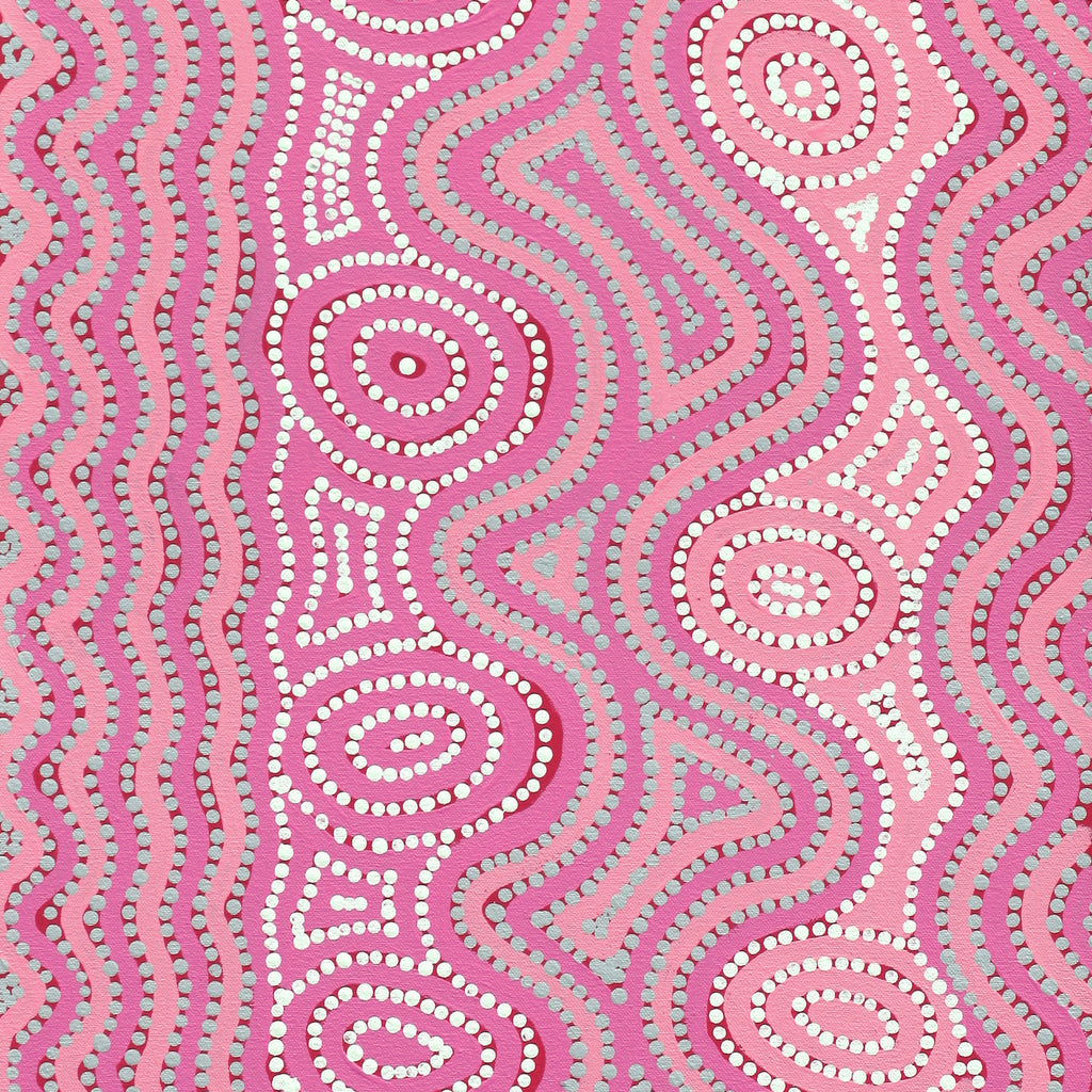 This painting shows the sandhills (tali tali) at Kungkayunti (Brown's Bore). Kungkayunti is the place where the ancestral women are dancing along the creek bed.
