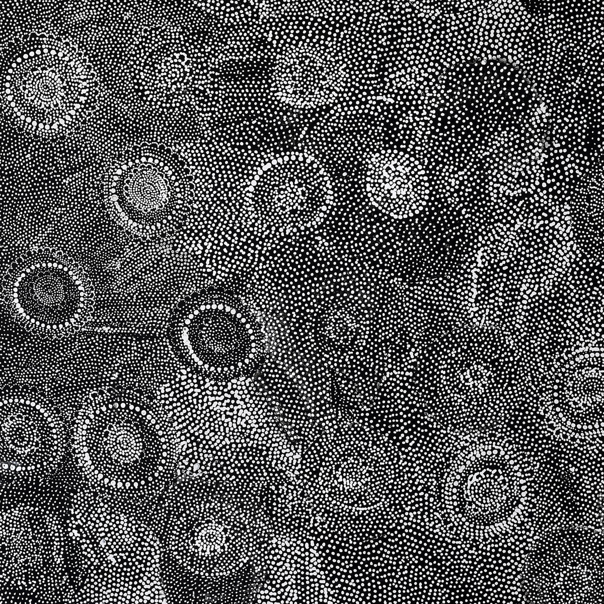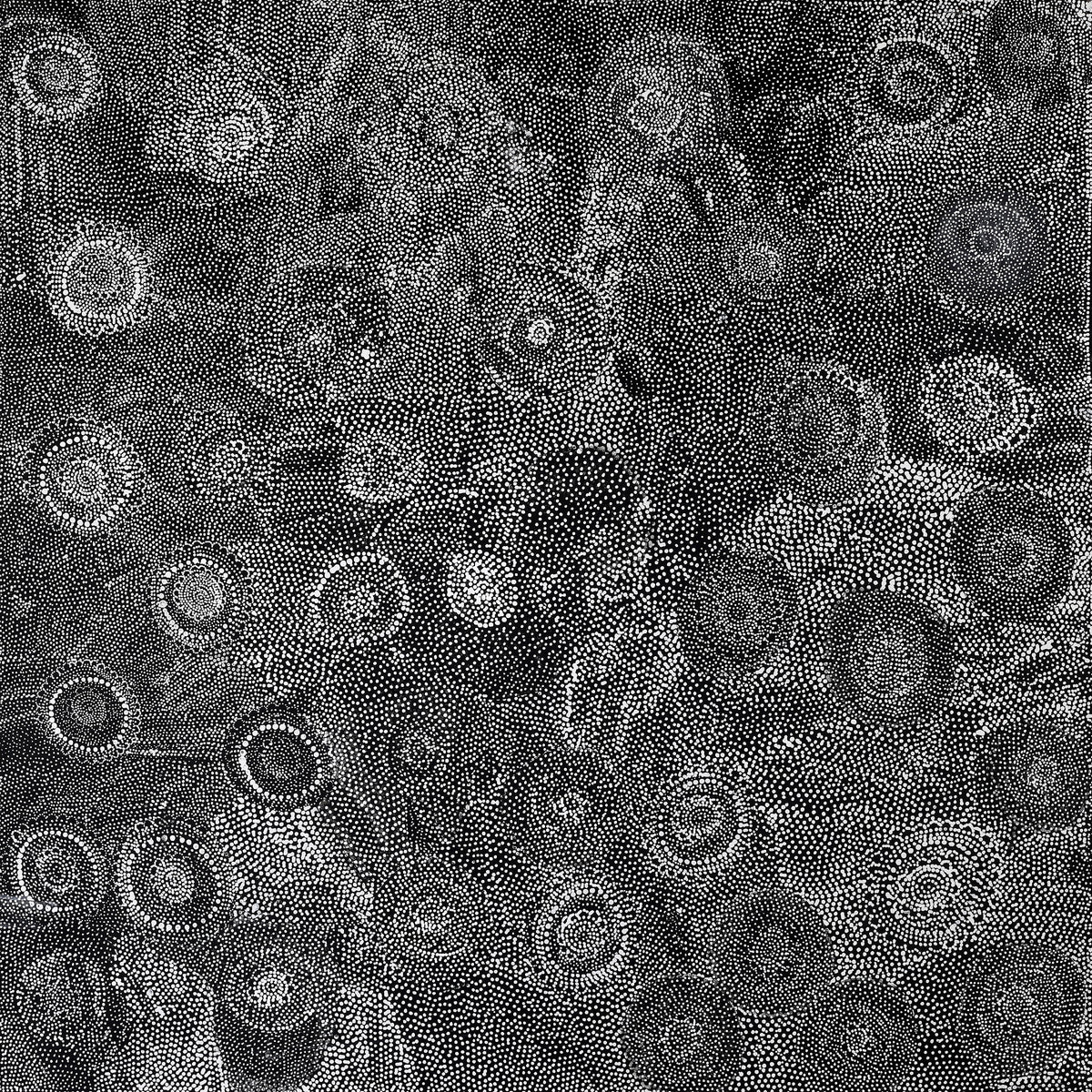 In contemporary Warlpiri paintings, traditional iconography is used to represent the ‘Jukurrpa’ (Dreaming), associated sites, and other elements. In many paintings of this Dreaming, short dashes are often used to represent ‘mangkurdu’ (cumulus & stratocumulus clouds), and longer, flowing lines represent ‘ngawarra’ (flood waters). Small circles are used to depict ‘mulju’ (soakages) and river beds.