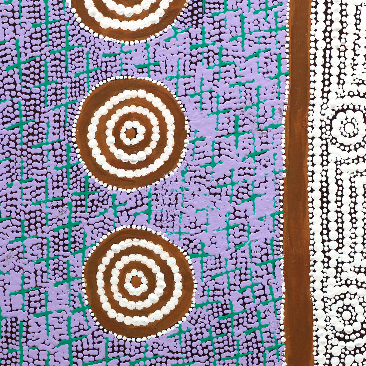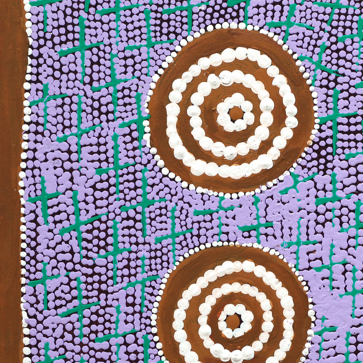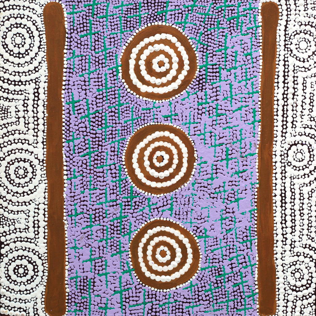 The Jukurrpa site shown in this painting for Ngatijirri (budgerigar [Melopsittacus undulates]) is at Yangarnmpi, south of Yuendumu. ‘Ngatijirri’ are small, bright green birds native to central Australia which are common around the Yuendumu area, especially after the summer rains. Men would hunt for ‘ngatijirri’ nests, robbing them of eggs and juvenile birds, which are both considered delicacies. The men would also go out hunting for adult, flying ‘ngatijirri’, which they would kill by swinging branches, killing sticks or ‘karli’ (boomerangs) to hit the birds in flight. The ‘ngatijirri’ travelled to Yangarnmpi from Patirlirri, near Willowra to the east of Yuendumu and travelled further on to Marngangi, north/west of Mount Dennison and west of Yuendumu. Each time the flock of ancestral ‘ngatijirri’ lands, they perform ceremonies, singing and dancing as they fly and roost in the trees. The sites of these ceremonies are depicted in this painting as concentric circles, while cross-like shapes depict the footprints of the birds on the ground and give an indication of the large flocks of ‘ngatijirri’ that can be found near Yangarnmpi and other sites close to Yuendumu. After good rains ‘ngatijirri’ can successfully breed several times, resulting in an explosion of the population in a short time. Custodians for the Ngatijirri Jukurrpa are Napaljarri/Nungarrayi women and Japaljarri/Jungarrayi men.
