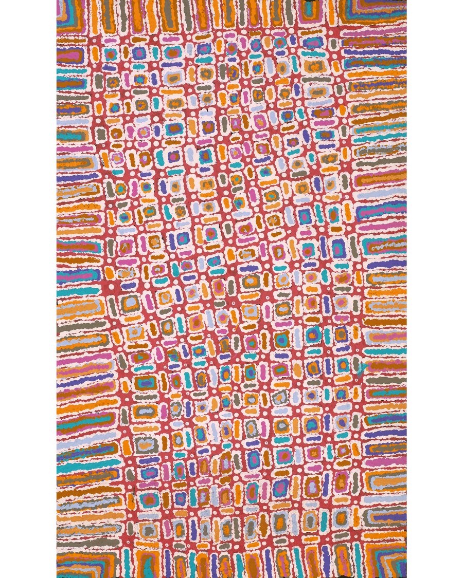 This artwork comes from Warlukurlangu Artists in Yuendumu. The art centre represents Warlpiri artists from Yuendumu and Nyirripi, located in the Tanami Desert northwest of Alice Springs. This remote region of red sand and open desert Country is central to the stories and knowledge shared through the paintings.