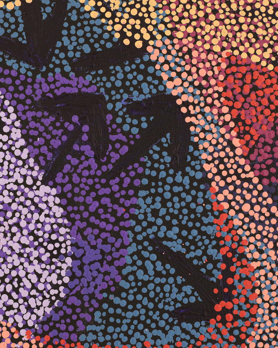 This particular site of the Yankirri Jukurrpa, (emu Dreaming [Dromaius novaehollandiae]) is at Ngarlikurlangu, north of Yuendumu. The ‘yankirri’ travelled to the rockhole at Ngarlikurlangu to find water. This Jukurrpa story belongs to Jangala/Jampijinpa men and Nangala/Nampijinpa women. In contemporary Warlpiri paintings traditional iconography is used to represent the Jukurrpa, associated sites and other elements. Emus are usually represented by their ‘wirliya’ (footprints), arrow-like shapes that show them walking around Ngarlikurlangu eating ‘yakajirri’ (bush raisin [Solanum centrale]). In the time of the Jukurrpa there was a fight at Ngarlikiurlangu between a ‘yankirri’ ancestor and Wardilyka (Australian bustard [Ardeotis australis]) ancestors over sharing the ‘yakajirri’. There is also a dance for this Jukurrpa that is performed during initiation ceremonies.