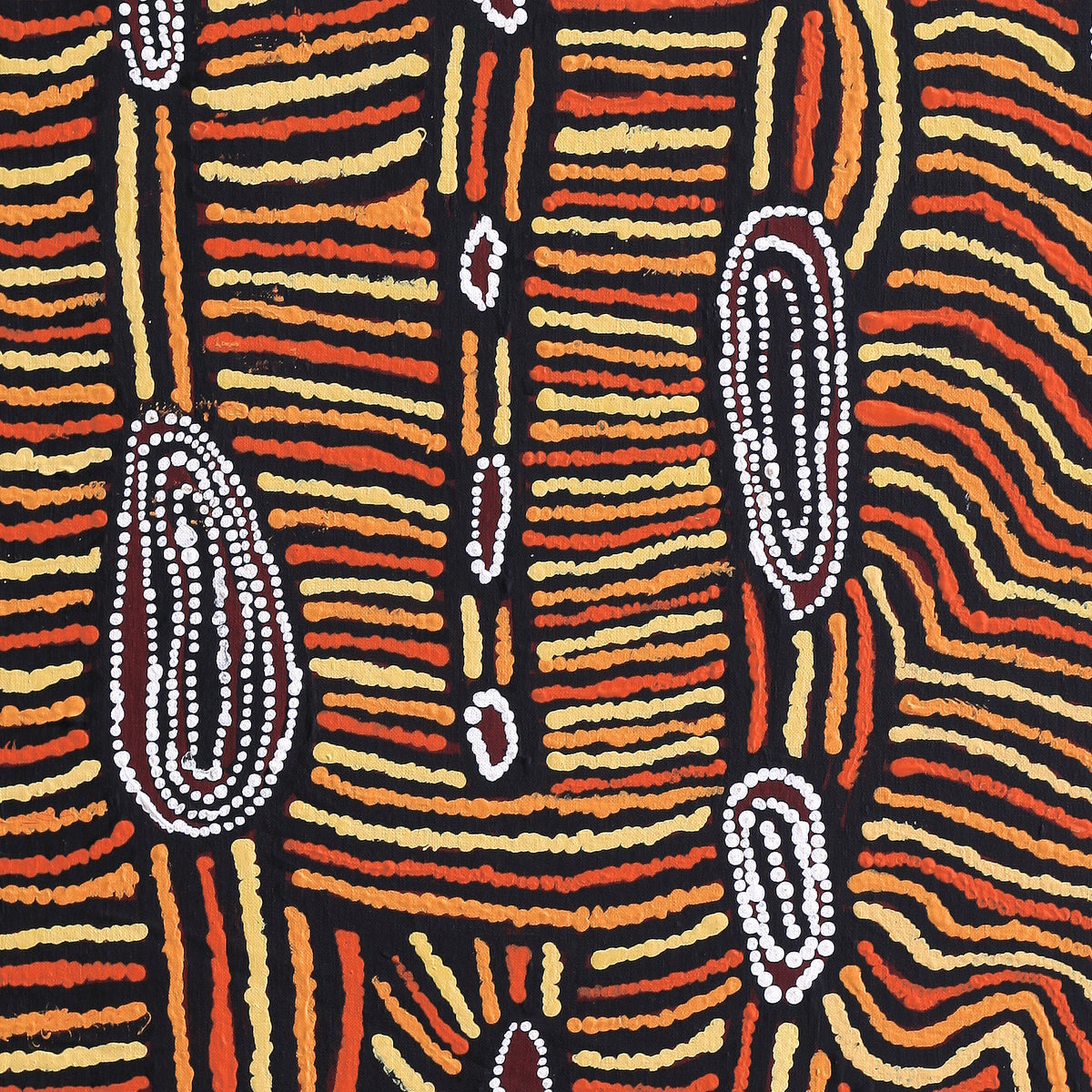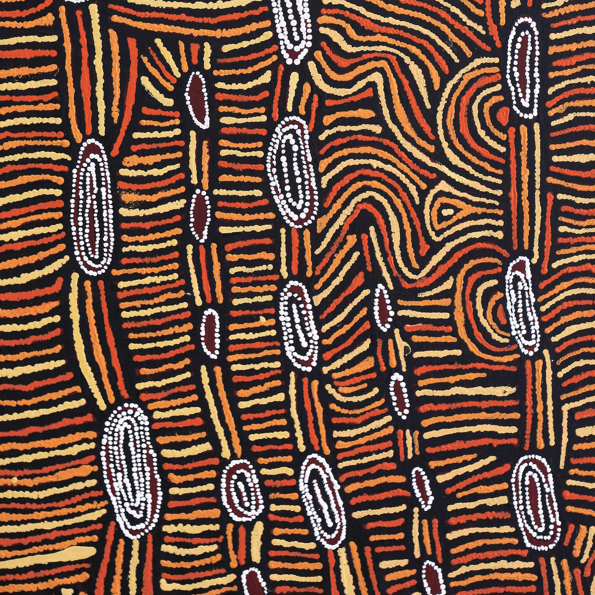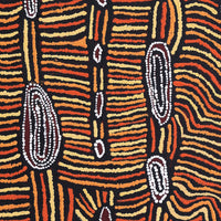 This ‘Jukurrpa’ (Dreaming) comes from Mina Mina, a very important women’s Dreaming site far to the west of Yuendumu near Lake Mackay and the WA border. The ‘kirda’ (owners) of this Dreaming are Napangardi/Napanangka women and Japangardi/Japanangka men; the area is sacred to Napangardi and Napanangka women. There are a number of ‘mulju’ (water soakages) and a ‘maluri’ (clay pan) at Mina Mina.