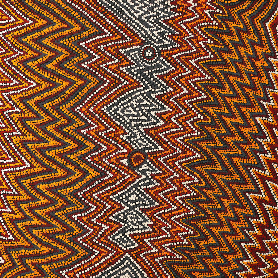 The ‘kirda’ (owners) of this country are Napangardi/Napanangka women and Japangardi/Japanangka men, who can depict portions of the Mina Mina Jukurrpa in their paintings. There are a number of different components of the Mina Mina Jukurrpa; artists usually choose to depict one particular aspect. These can include ‘karnta’ (women), ‘karlangu’ (digging sticks), ‘majardi’ (hairstring skirts/tassels), ‘ngalyipi’ (snakevine [Tinospora smilacina]), ‘jintiparnta’ (desert truffle [Elderia arenivaga]), and ‘kurrkara’ (desert oak [Allocasuarina decaisneana]).
