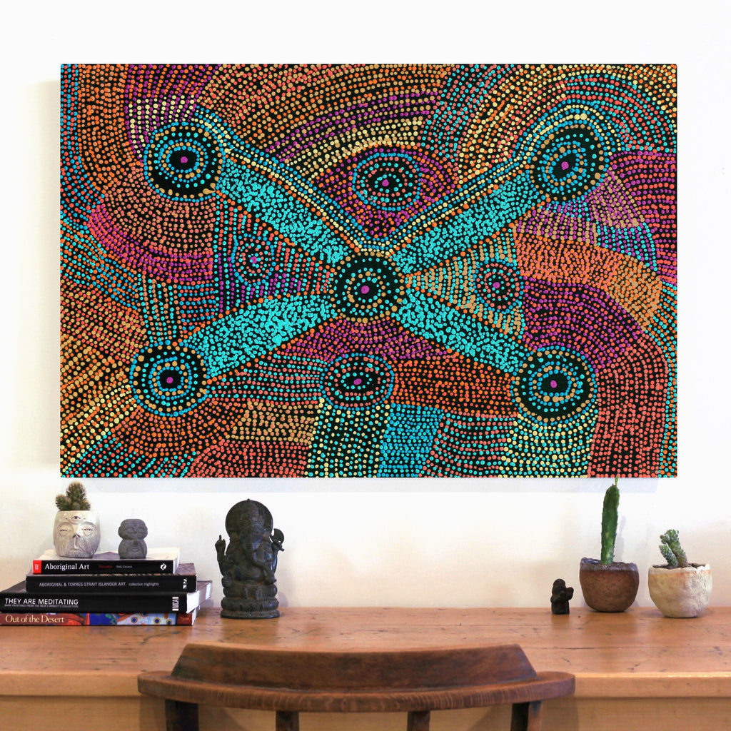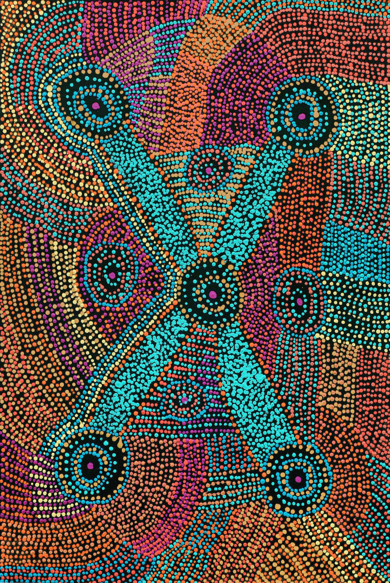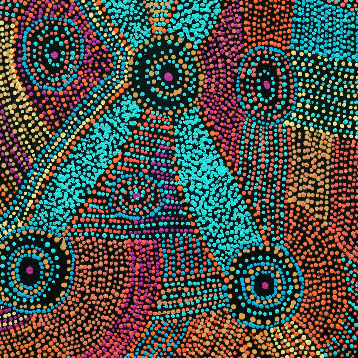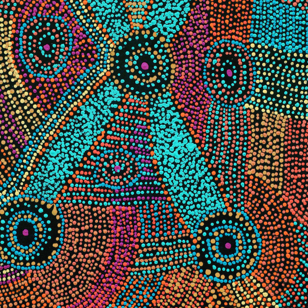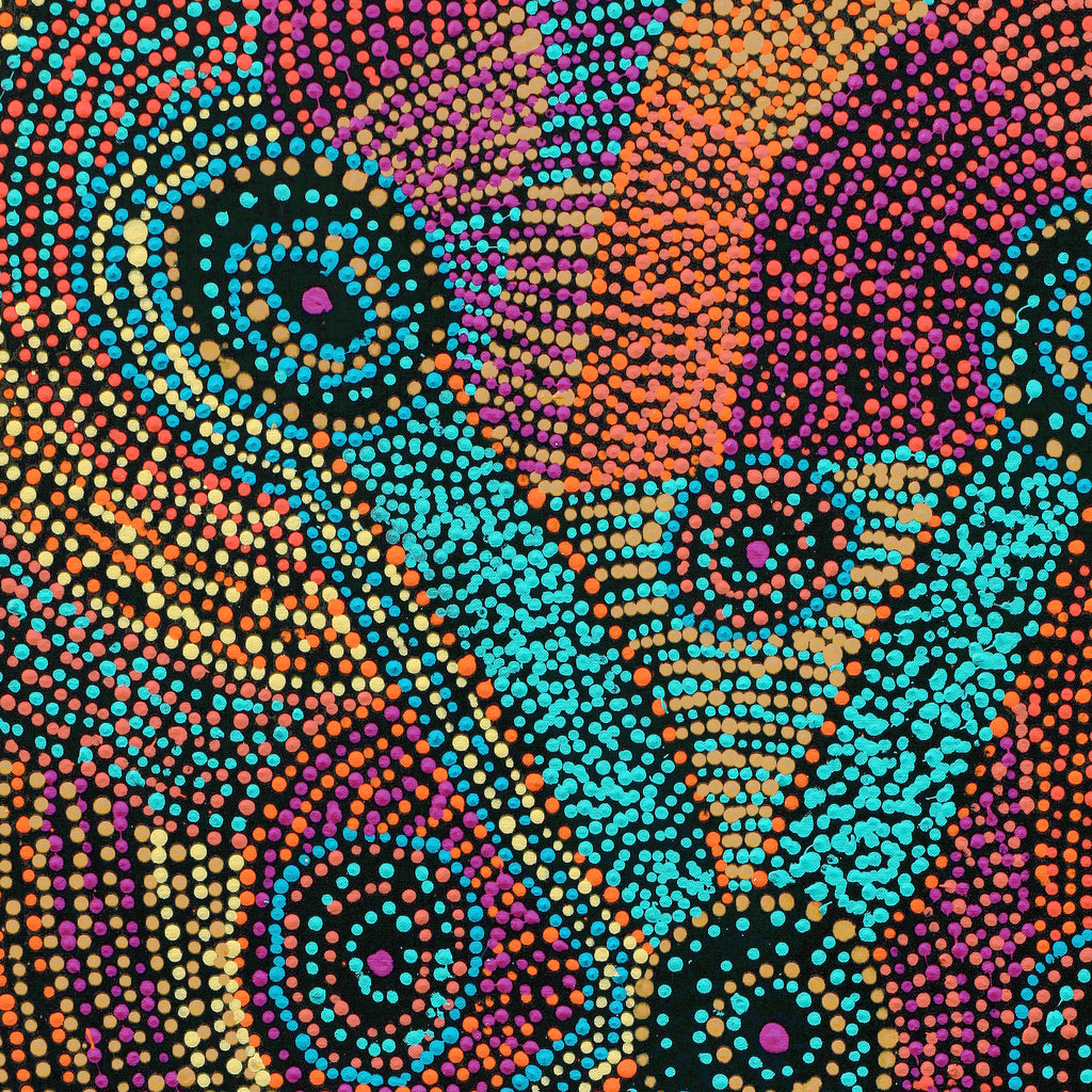 Megan began painting with Warlukurlangu Artists Aboriginal Corporation, an Aboriginal owned and governed art centre located in Yuendumu and Nyirripi, in 2016. “I like colours and patterns . . . they make me happy . . . I paint my Grandmother’s Story”. Her grandmother’s country is Karrku – a large hill and the home of a sacred ochre mine (Mount Stanley), a 20-minute drive from Nyirrpi. Megan uses colour and patterns which she creatively combines to blend traditional motifs with her own ideas of modern design to represent her grandmother’s country.