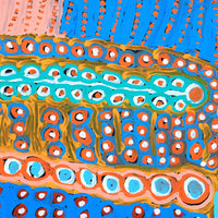 Murdie has been painting with Warlukurlangu Artists Aboriginal Corporation, an Aboriginal owned and governed art centre located in Yuendumu, since 2012. She was prompted to paint when she attended a workshop in 2012. She enjoys painting, and paints her father’s jukurrpa,Maliki Jukurrpa (Domestic Dog Dreaming) andMalikijarra Jukurrpa (Two Dog Dreaming). Dreamings that have been passed down through the generations for millennia and relate directly to the land, its features and the animals and plants that inhabit it. She uses an unrestricted palette to develop a modern interpretation of her traditional culture.