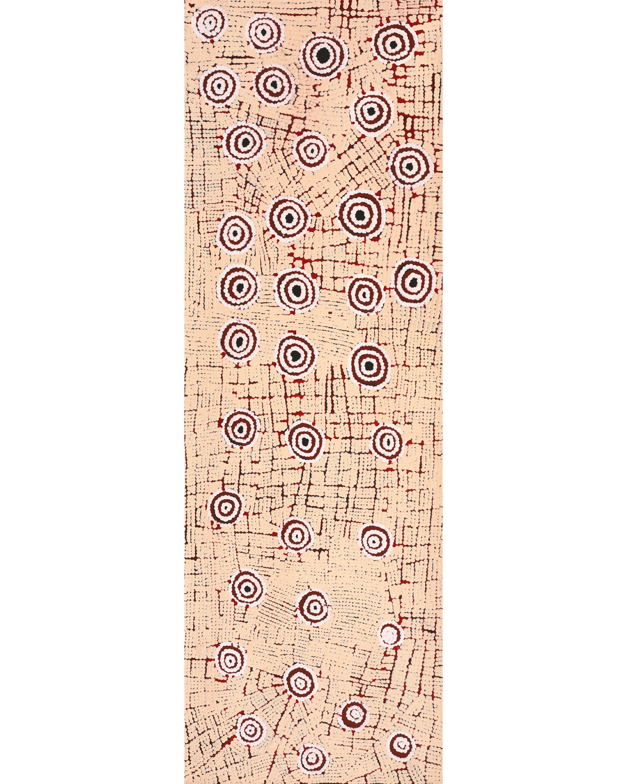 Narelle has been painting with Warlukurlangu Artists Aboriginal Corporation, an Aboriginal owned and governed art centre located in Yuendumu, since 2008. She paints her grandmother’s Watiya-Warnu Jukurrpa (Seed Dreaming) and her parents Ngapa Jukurrpa (Water Dreaming). ‘Dreamings’ that relate directly to her land, its features and the plants and animals that inhabit it. These stories have been passed down to her by her parents and their parents before them for millennia. Initially she used traditional iconography but over time she has developed an individualistic style using an unrestricted palette, and pattern and design in a variety of contexts to depict her traditional jukurrpa.
