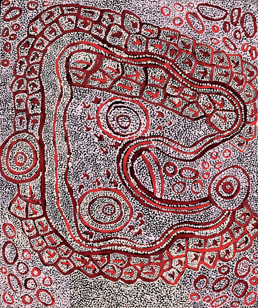 This particular site of the Yankirri Jukurrpa, (emu Dreaming [Dromaius novaehollandiae]) is at Ngarlikurlangu, north of Yuendumu. The ‘yankirri’ travelled to the rockhole at Ngarlikurlangu to find water. This Jukurrpa story belongs to Jangala/Jampijinpa men and Nangala/Nampijinpa women. In contemporary Warlpiri paintings traditional iconography is used to represent the Jukurrpa, associated sites and other elements. Emus are usually represented by their ‘wirliya’ (footprints), arrow-like shapes that show them walking around Ngarlikurlangu eating ‘yakajirri’ (bush raisin [Solanum centrale]). In the time of the Jukurrpa there was a fight at Ngarlikiurlangu between a ‘yankirri’ ancestor and Wardilyka (Australian bustard [Ardeotis australis]) ancestors over sharing the ‘yakajirri’. There is also a dance for this Jukurrpa that is performed during initiation ceremonies.