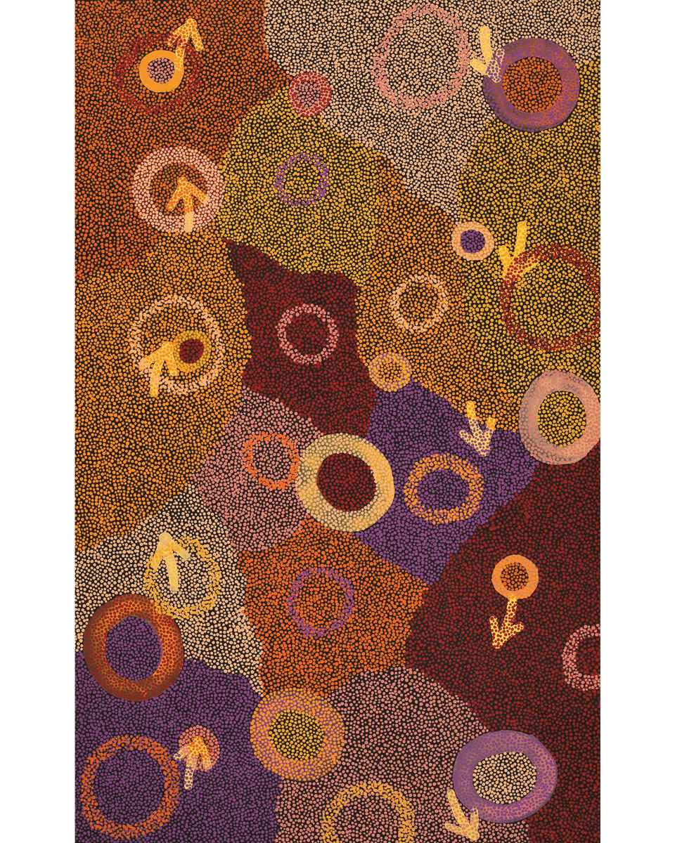 This particular site of the Yankirri Jukurrpa, (emu Dreaming [Dromaius novaehollandiae]) is at Ngarlikurlangu, north of Yuendumu. The ‘yankirri’ travelled to the rockhole at Ngarlikurlangu to find water. This Jukurrpa story belongs to Jangala/Jampijinpa men and Nangala/Nampijinpa women. In contemporary Warlpiri paintings traditional iconography is used to represent the Jukurrpa, associated sites and other elements. Emus are usually represented by their ‘wirliya’ (footprints), arrow-like shapes that show them walking around Ngarlikurlangu eating ‘yakajirri’ (bush raisin [Solanum centrale]). In the time of the Jukurrpa there was a fight at Ngarlikiurlangu between a ‘yankirri’ ancestor and Wardilyka (Australian bustard [Ardeotis australis]) ancestors over sharing the ‘yakajirri’. There is also a dance for this Jukurrpa that is performed during initiation ceremonies.