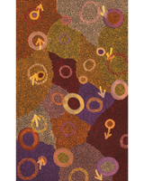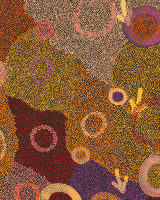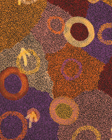 “Painting keeps me busy. I like doing painting. I like the stories and like the colour.” Pauline Nampijinpa Singleton was born in Alice Springs hospital and grew up in Yuendumu an Aboriginal settlement located 290 kms north west of Alice Springs in the NT of Australia. She attended the local school and then moved to Alice Springs to attend Yirara College. After finishing school she moved back to Yuendumu and has been painting with the Warlukurlangu Artists since 1999. She is very actively involved with the local Mt Theo Youth Program helping to take care of the kids. She has also worked with Warlpiri Media doing broadcasting for local language radio programs. Pauline is married and has two young children, Bradley and Ishmail who take up a lot of her time. Pauline Paints her mother’s Jukurrpa stories, Dreamings which relate directly to her land, its features and the plants and animals that inhabit it. These stories were passed down to her by her mother and her mother’s mother before them for millennia. Pauline loves spending time visiting the country around Yuendumu and telling her kids the stories of this land. When she is painting she sometimes paints by herself and sometimes with her family. When Pauline is not working, looking after children or painting she likes to go hunting for bush tucker.