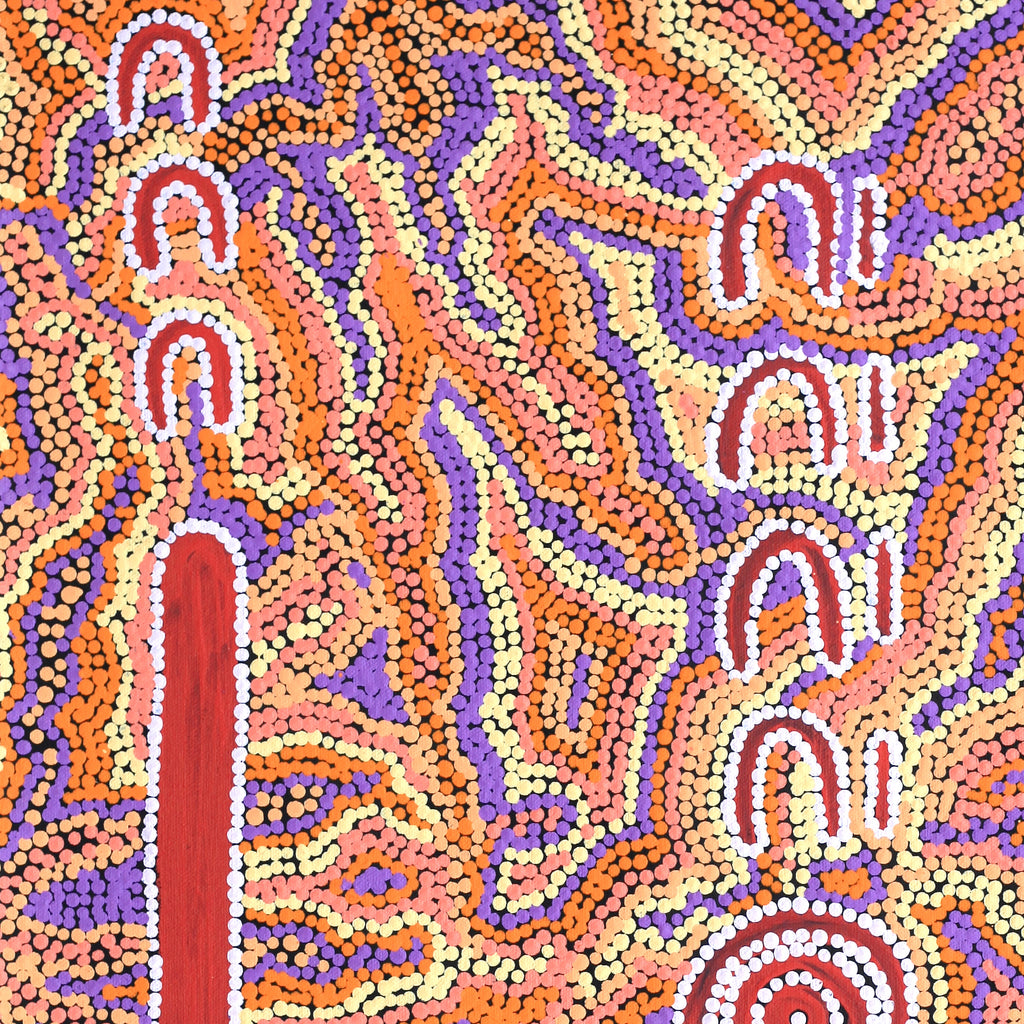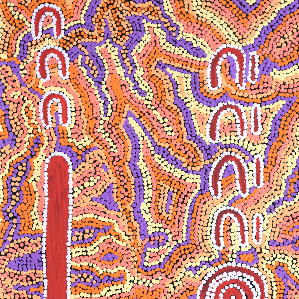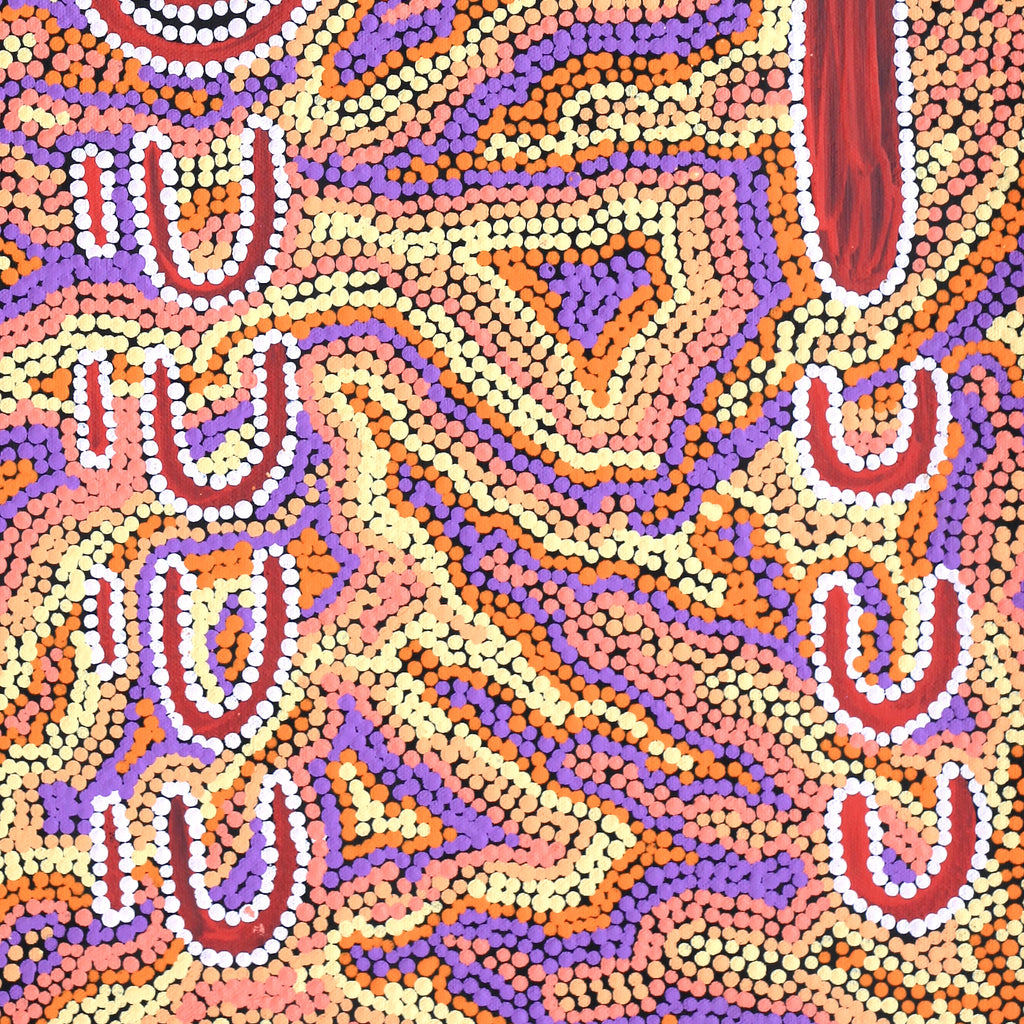 This ‘Jukurrpa’ (Dreaming) comes from Mina Mina, a very important women’s Dreaming site far to the west of Yuendumu near Lake Mackay and the WA border. The ‘kirda’ (owners) of this Dreaming are Napangardi/Napanangka women and Japangardi/Japanangka men; the area is sacred to Napangardi and Napanangka women. There are a number of ‘mulju’ (water soakages) and a ‘maluri’ (clay pan) at Mina Mina.