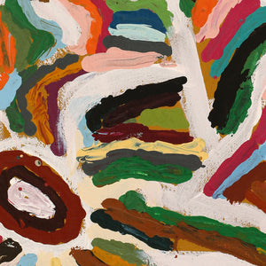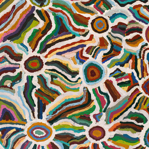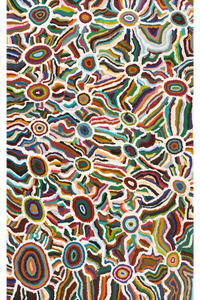 Ngayuku Ngura means ‘My Place’. Samuel uses an extensive palette of colours to paint the country surrounding Kalka and Pipalyatjara. His paintings feature the various land formations from that area - rockholes, creeks and hills. His land is a sacred men’s rockhole, so sacred that the name is not allowed to be written down or spoken about.