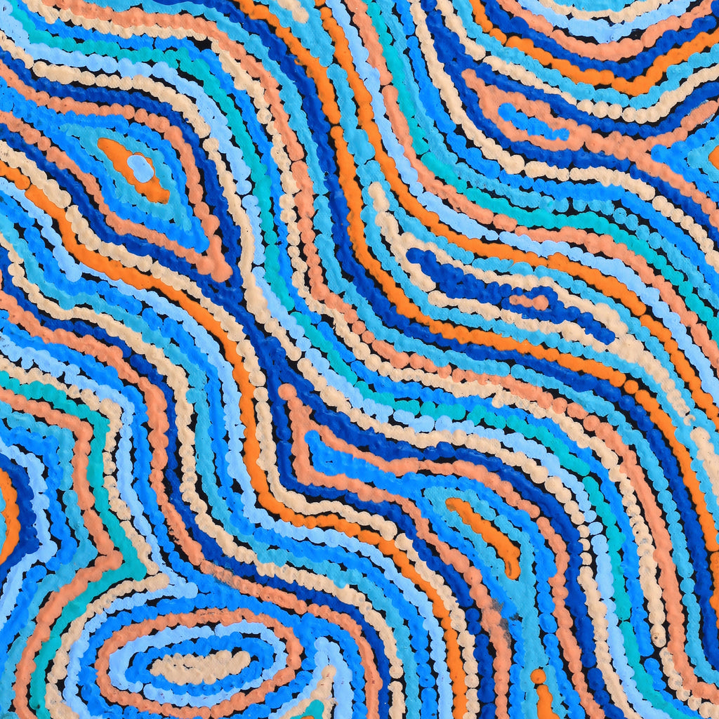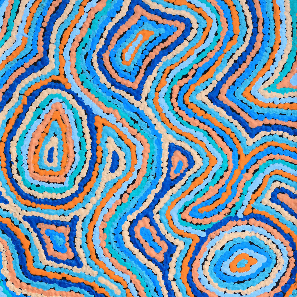 Sarah began painting with Warlukurlangu Artists Aboriginal Corporation, an Aboriginal owned and governed art centre located in Yuendumu, in 2013. The Art Centre makes regular visits to Nyirripi to drop off canvas, paint and brushes for the artists and to collect finished artwork. She paints her Grandmother’s Jukurrpa, stories about women’s ceremony held near Pikilyi (Vaughan Springs). ”I use to watch my grandmother paint and listen to her stories.” These stories have been passed down through generations for millennia and relate directly to the land, its features and the plants and animals that inhabit it. Sara finds painting relaxing and uses an unrestricted palette to develop a modern interpretation of her traditional culture.