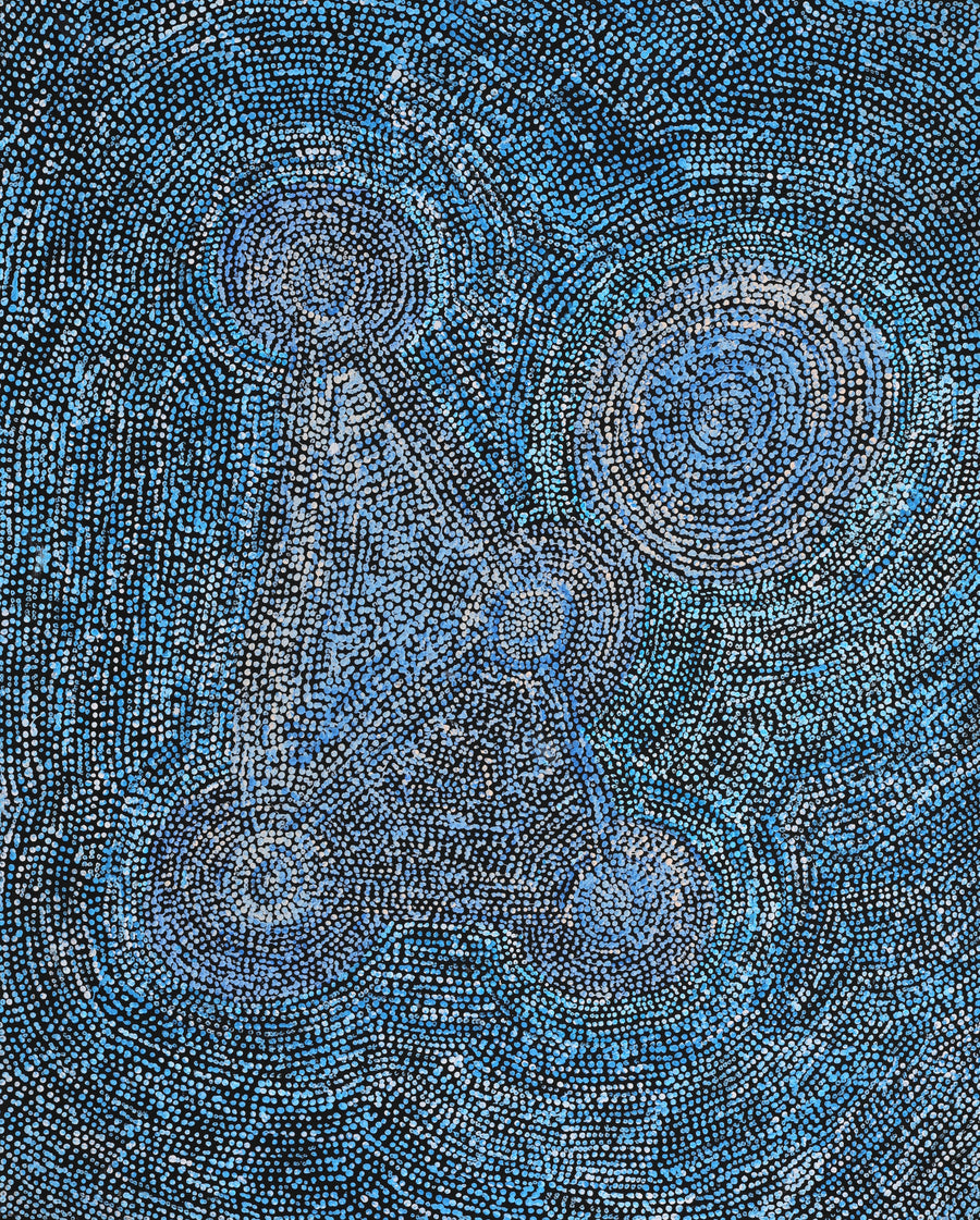 The site depicted in this painting is Puyurru, west of Yuendumu. In the usually dry creek beds are ‘mulju’ (soakages), or naturally occurring wells. The 'kirda' (owners) for this site are Nangala/Nampijinpa women and Jangala/Jampijinpa men. Two Jangala men, rainmakers, sang the rain, unleashing a giant storm. The storm travelled across the country from the east to the west, initially travelling with a ‘pamapardu Jukurrpa’ (termite Dreaming) from Warntungurru to Warlura, a waterhole 8 miles east of Yuendumu. At Warlura, a gecko called Yumariyumari blew the storm on to Lapurrukurra and Wilpiri. Bolts of lightning shot out at Wirnpa (also called Mardinymardinypa) and at Kanaralji. At this point the Dreaming track also includes the ‘kurdukurdu mangkurdu Jukurrpa’ (children of the clouds Dreaming). The water Dreaming built hills at Ngamangama using baby clouds and also stuck long pointy clouds into the ground at Jukajuka, where they can still be seen today as rock formations.